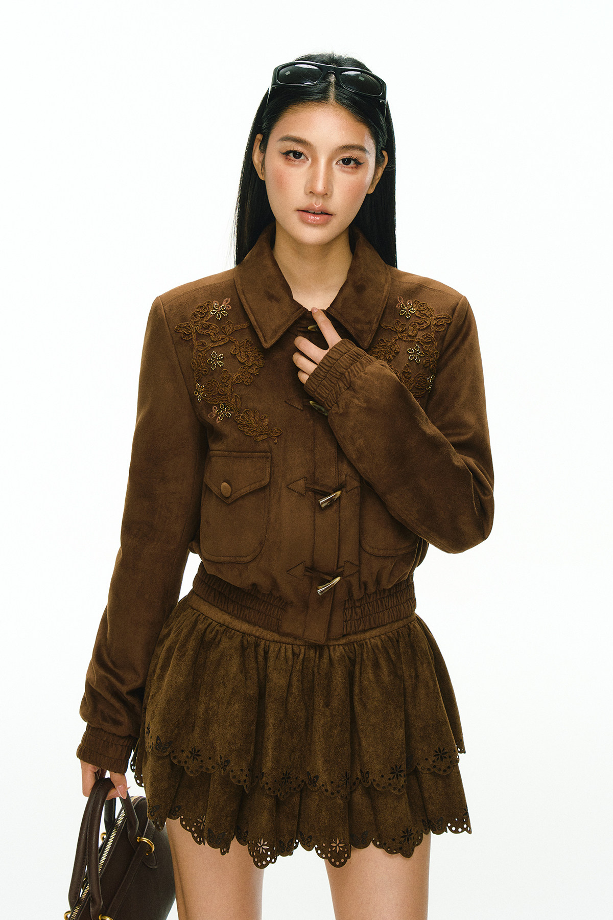 Ariseism 棕色麂皮暗纹绳绣翻领牛角扣夹棉棉服外套女冬季新款