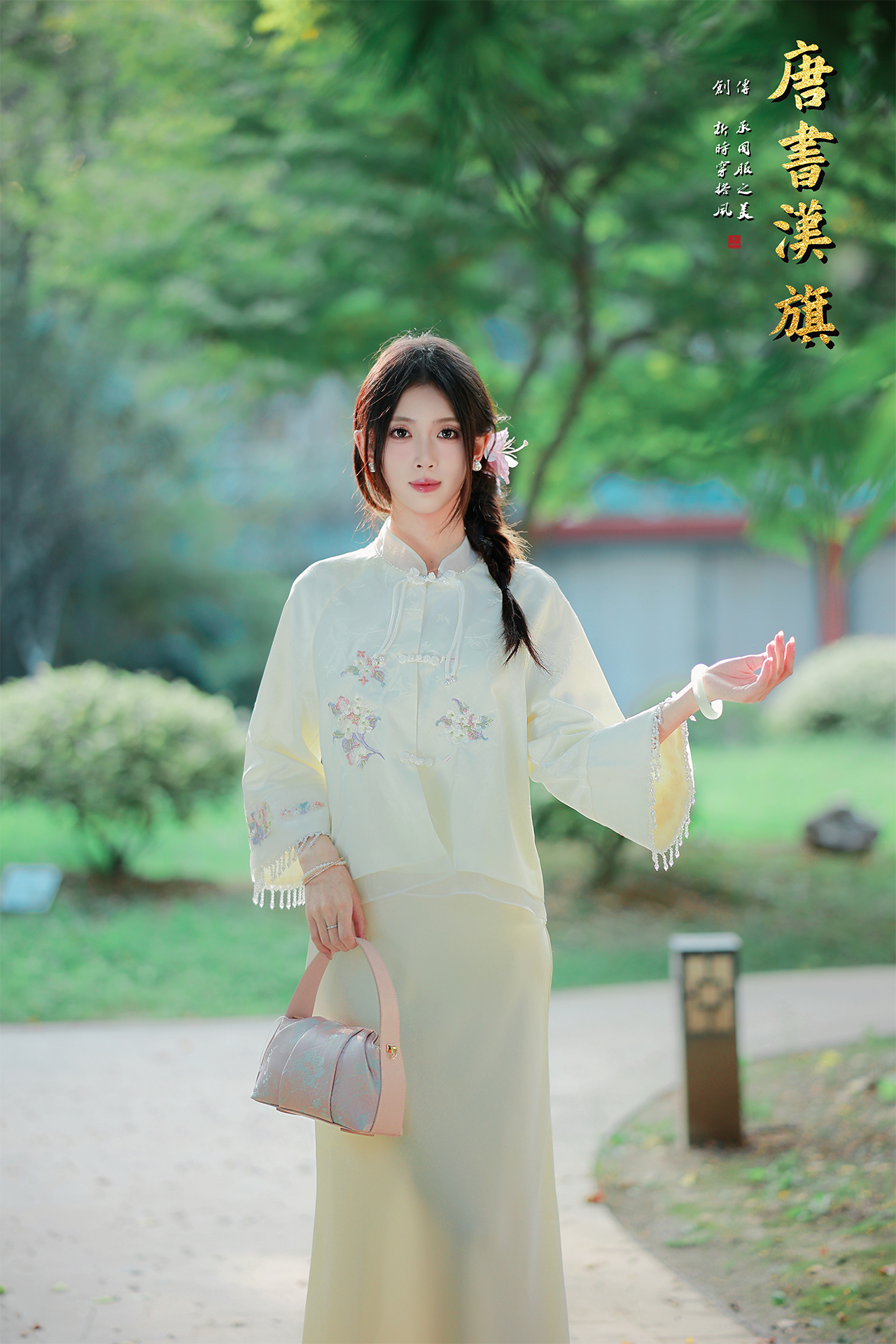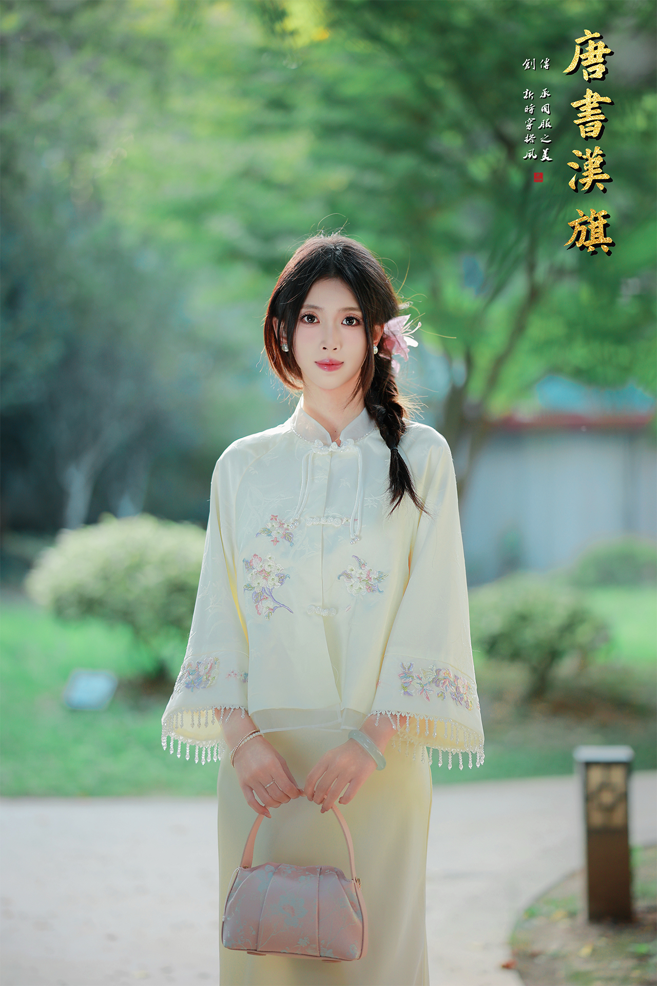【玉绣风羽华裳】米白刺绣中式短衫,萃国风灵韵,织就春日浪漫。 衣身以柔润米白为底,满幅绣制彩调花簇纹样,清新雅致;领口缀盘扣,袖口垂坠水晶流苏