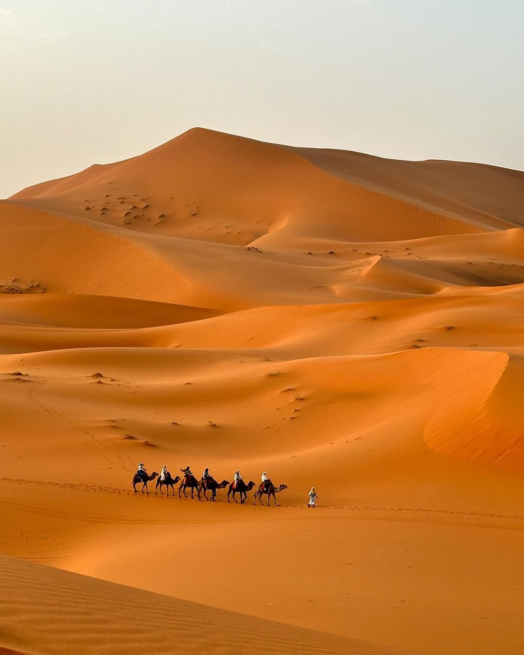 经过一段路程的行驶到达【梅祖卡】,进入沙漠腹地。安排骑骆驼在沙漠中穿行,这里的撒哈拉是独一无二的,以形态各异的沙丘闻名,更因为它会随着自然光线的变化,展现出金色、粉色等不同的美丽色泽。日出日落会有不同的美景,成为了摩洛哥境内独特的大漠风光,更成为无数人梦中的【撒哈拉】。