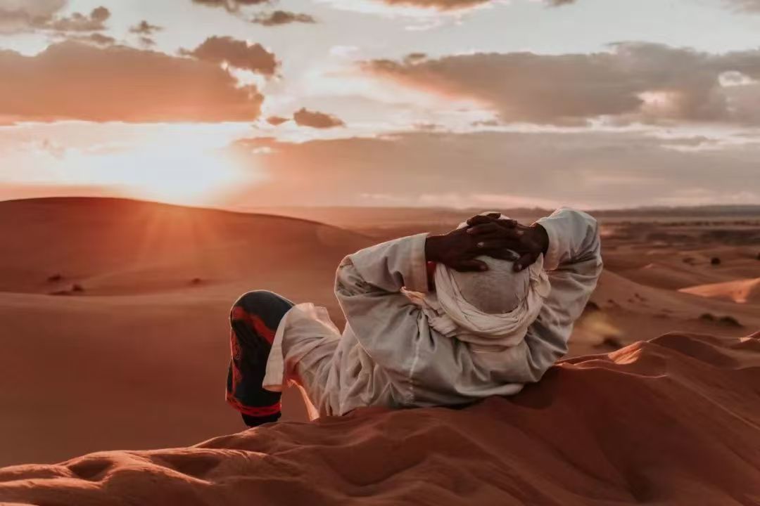 早上早早起来坐在撒哈拉沙漠高高的沙丘等待着太阳缓缓升起,享受着画一般宁静的沙漠美景。