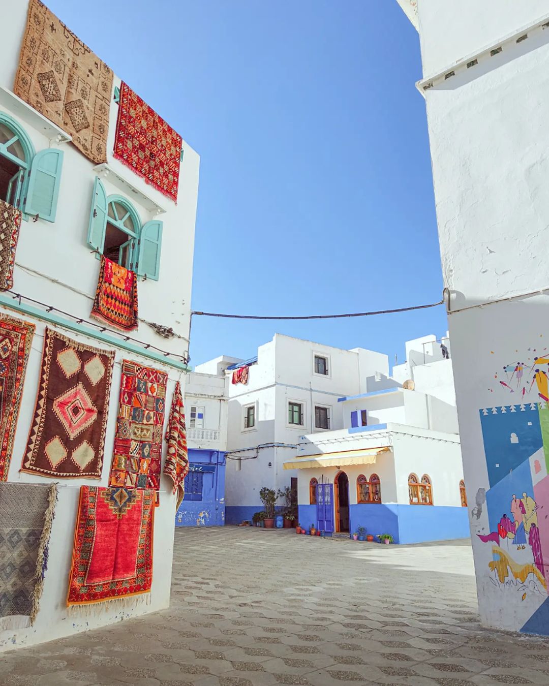 下午抵达【艾西拉】,一座北非的海滨小镇,在1978年,两位本地的知名艺术家,与他们来自世界各地的11位朋友一起,在小城中各处墙壁上画满了彩绘。这些作品出色彩鲜艳,艺术水平极高,吸引了大量的游客前来欣赏,因此这里也有涂鸦小镇之称。