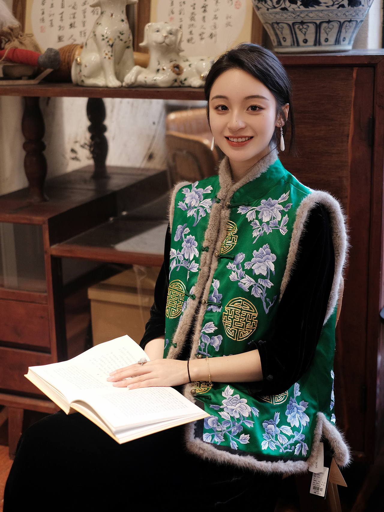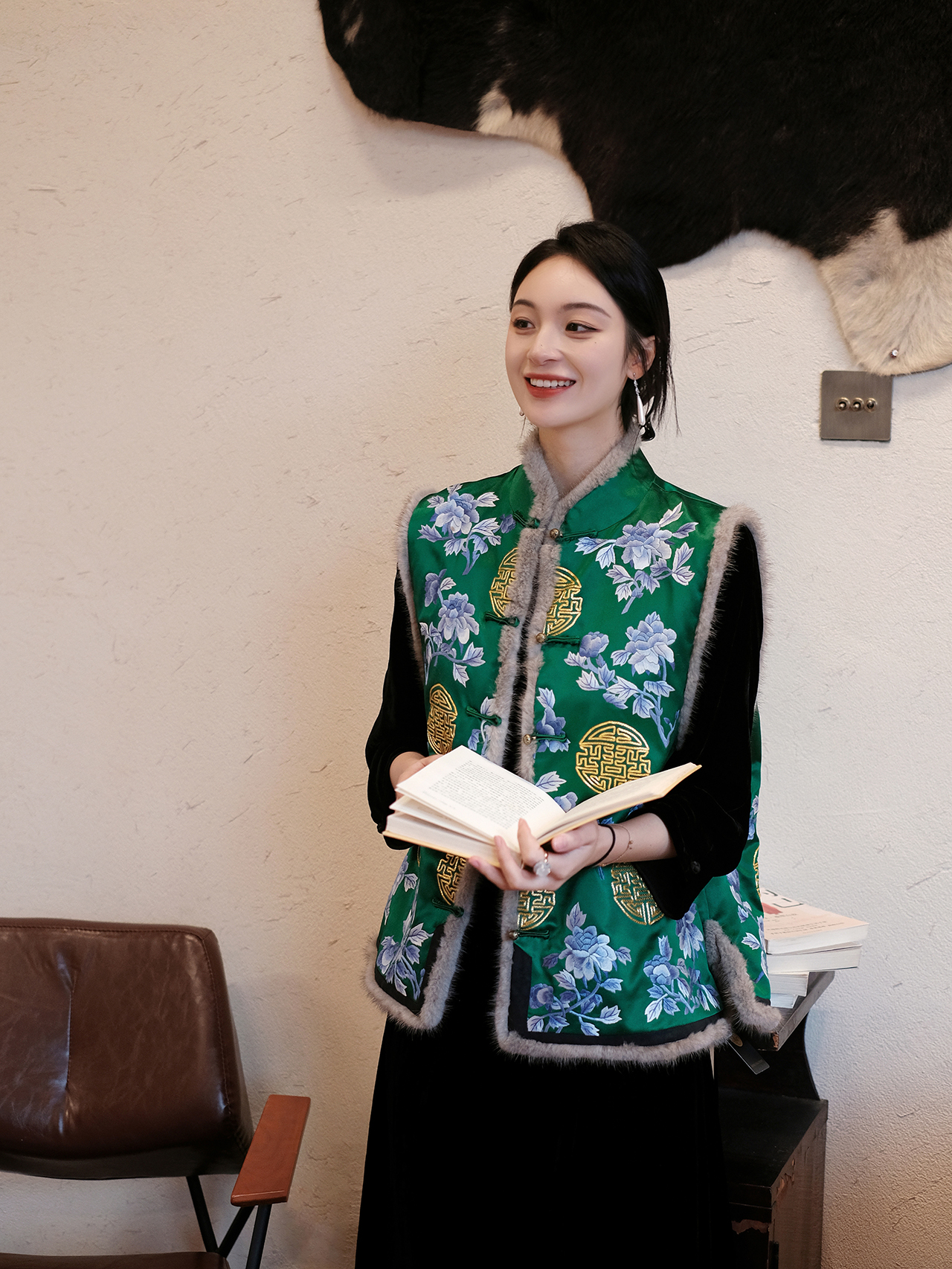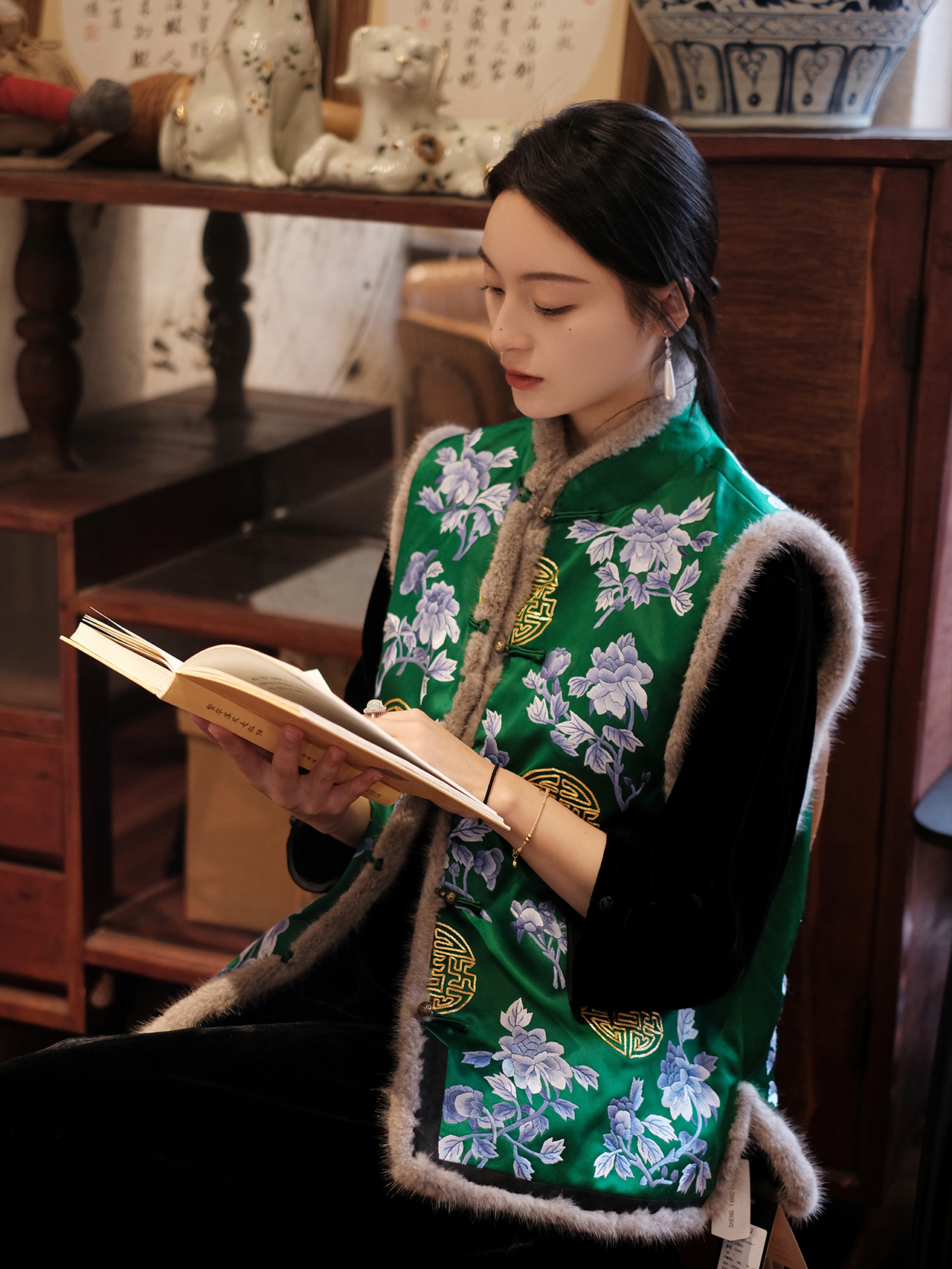 盛唐牡丹 |重缎真丝手绣对襟水貂毛马甲