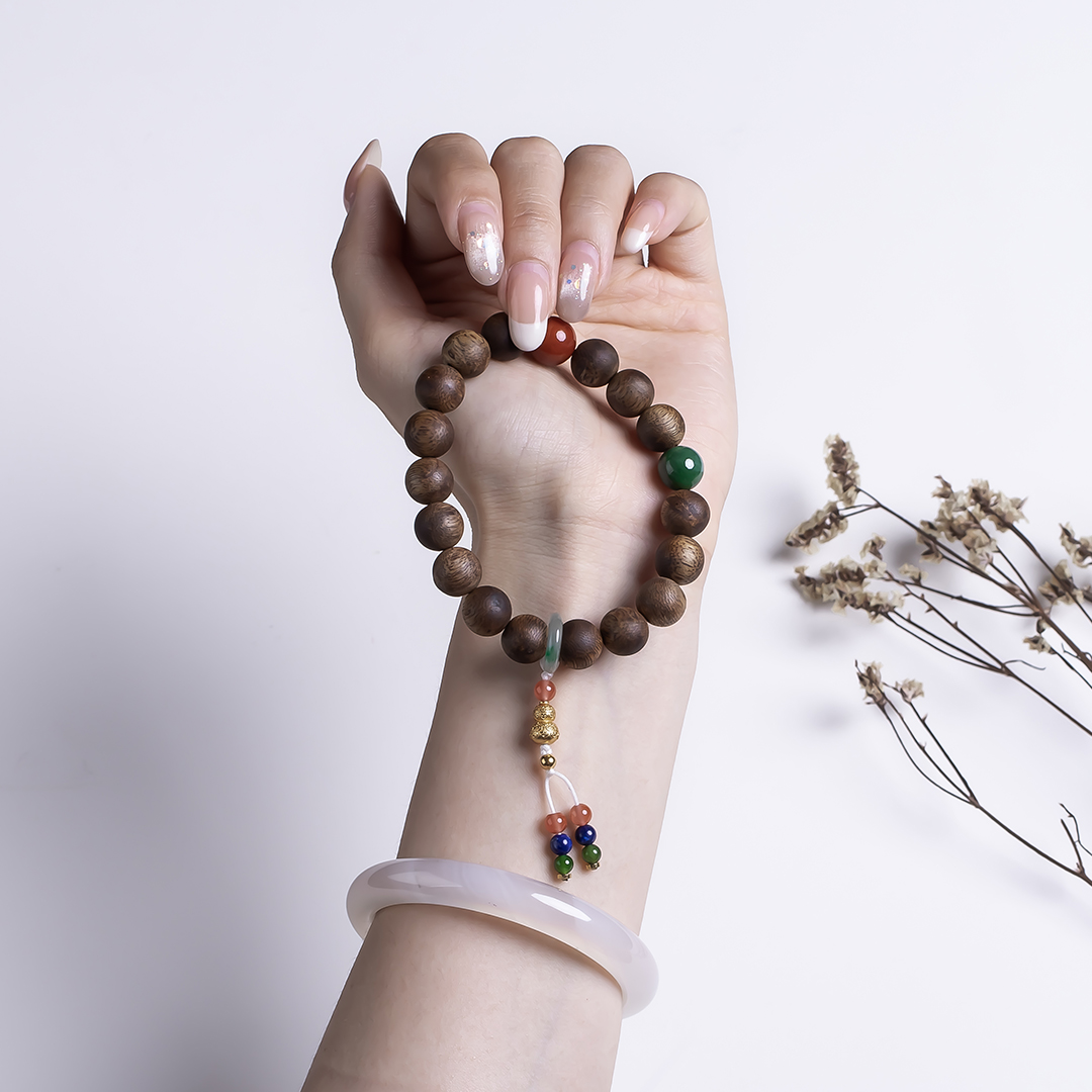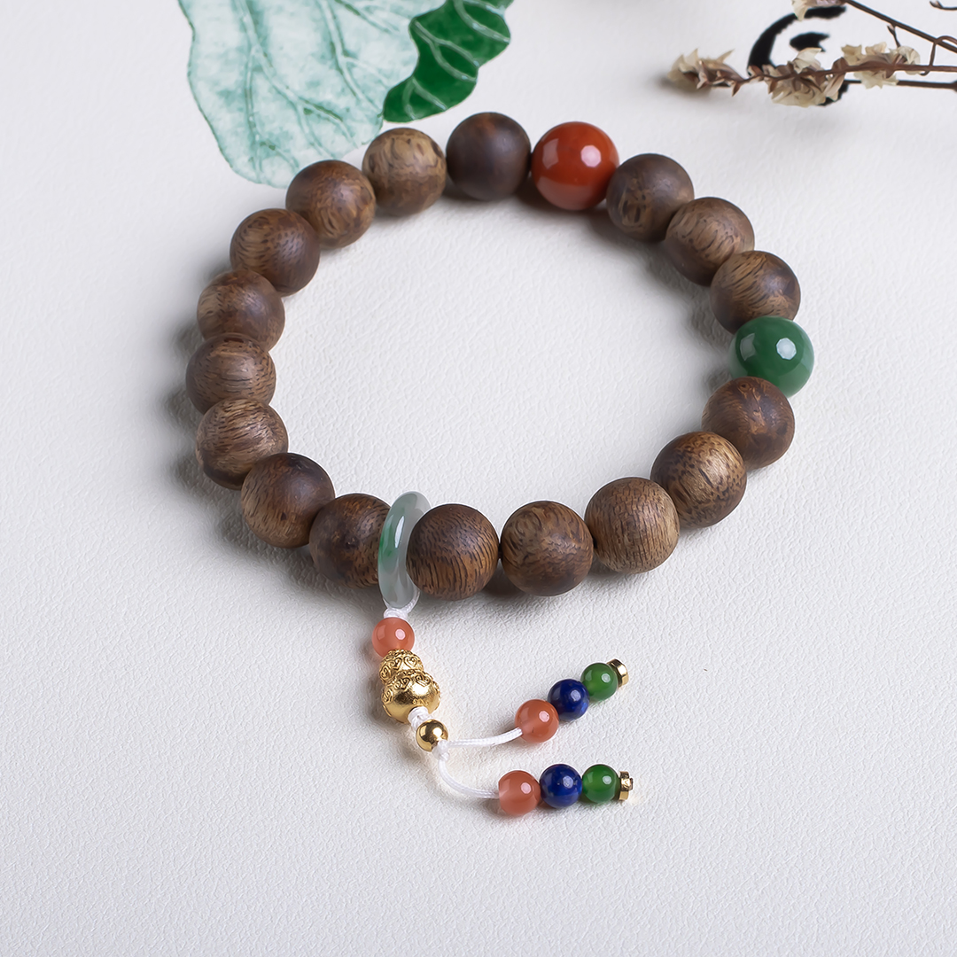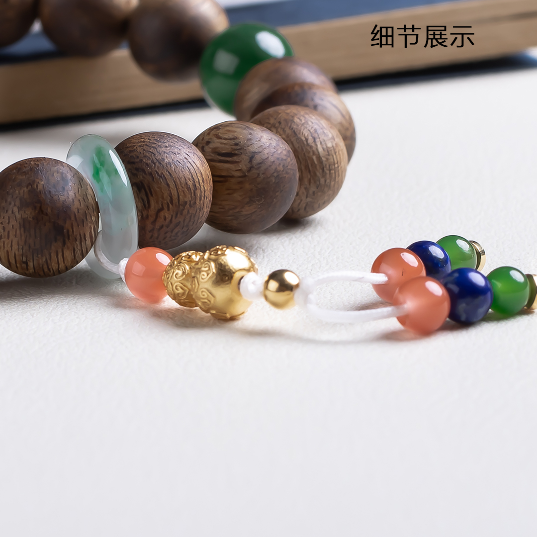 xy0501沉香碧玉南红葫芦小坠手串,天然沉香约10.3mm,原色原味,香味自然清甜,南红碧玉均是我国名玉,红绿经典又时尚的配色,一枚非洲翠小扣子接一枚银葫芦小坠,吉祥有福,国风设计,国潮穿搭。
