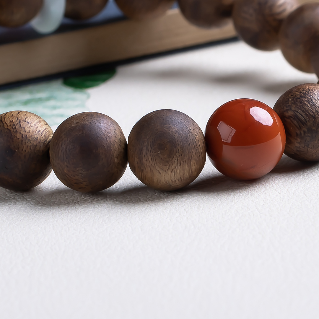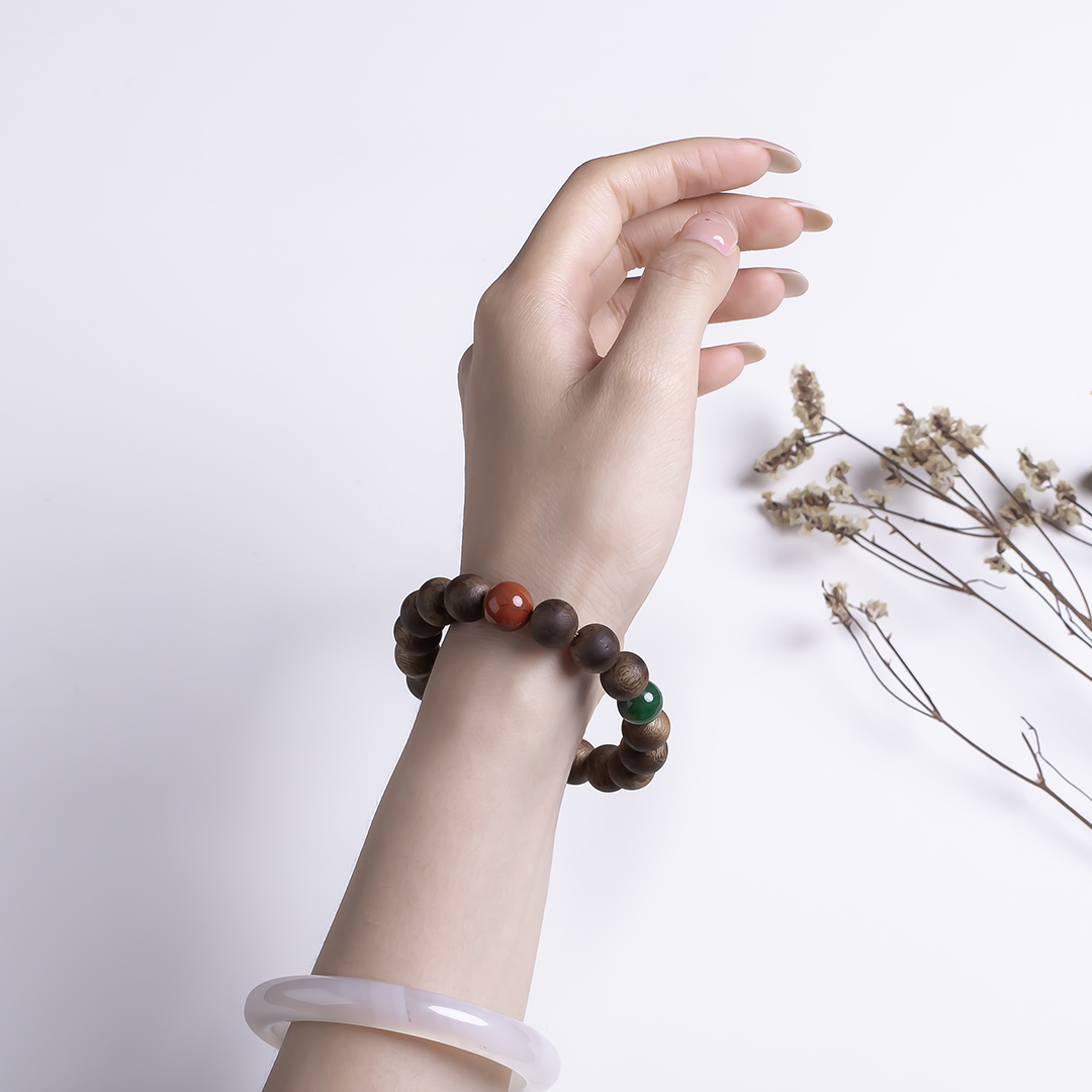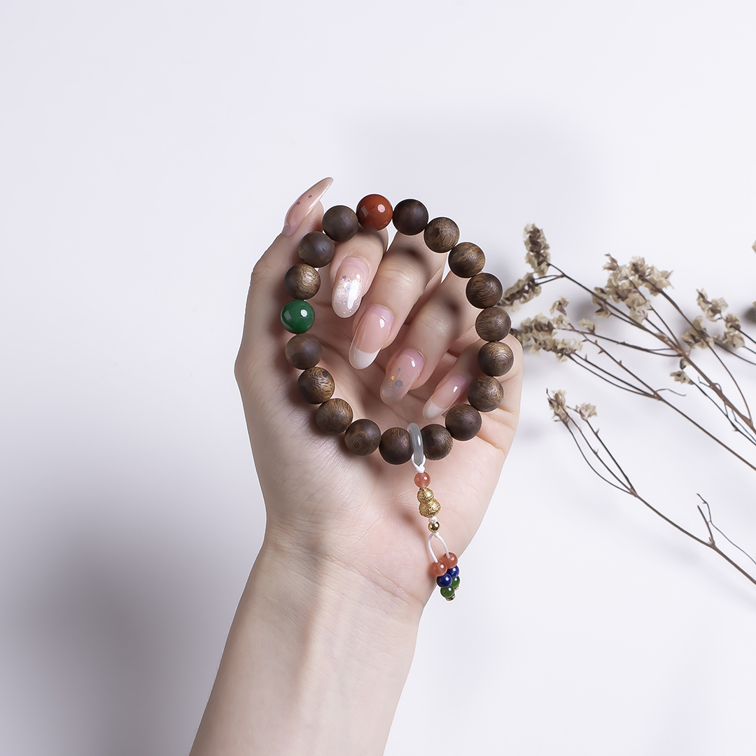 xy0501沉香碧玉南红葫芦小坠手串,天然沉香约10.3mm,原色原味,香味自然清甜,南红碧玉均是我国名玉,红绿经典又时尚的配色,一枚非洲翠小扣子接一枚银葫芦小坠,吉祥有福,国风设计,国潮穿搭。