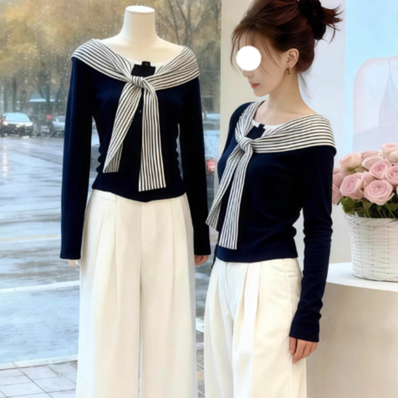 裁缝学苑AS623一字拼接条纹绑带长袖t恤纸样女装修身短上衣服装打板