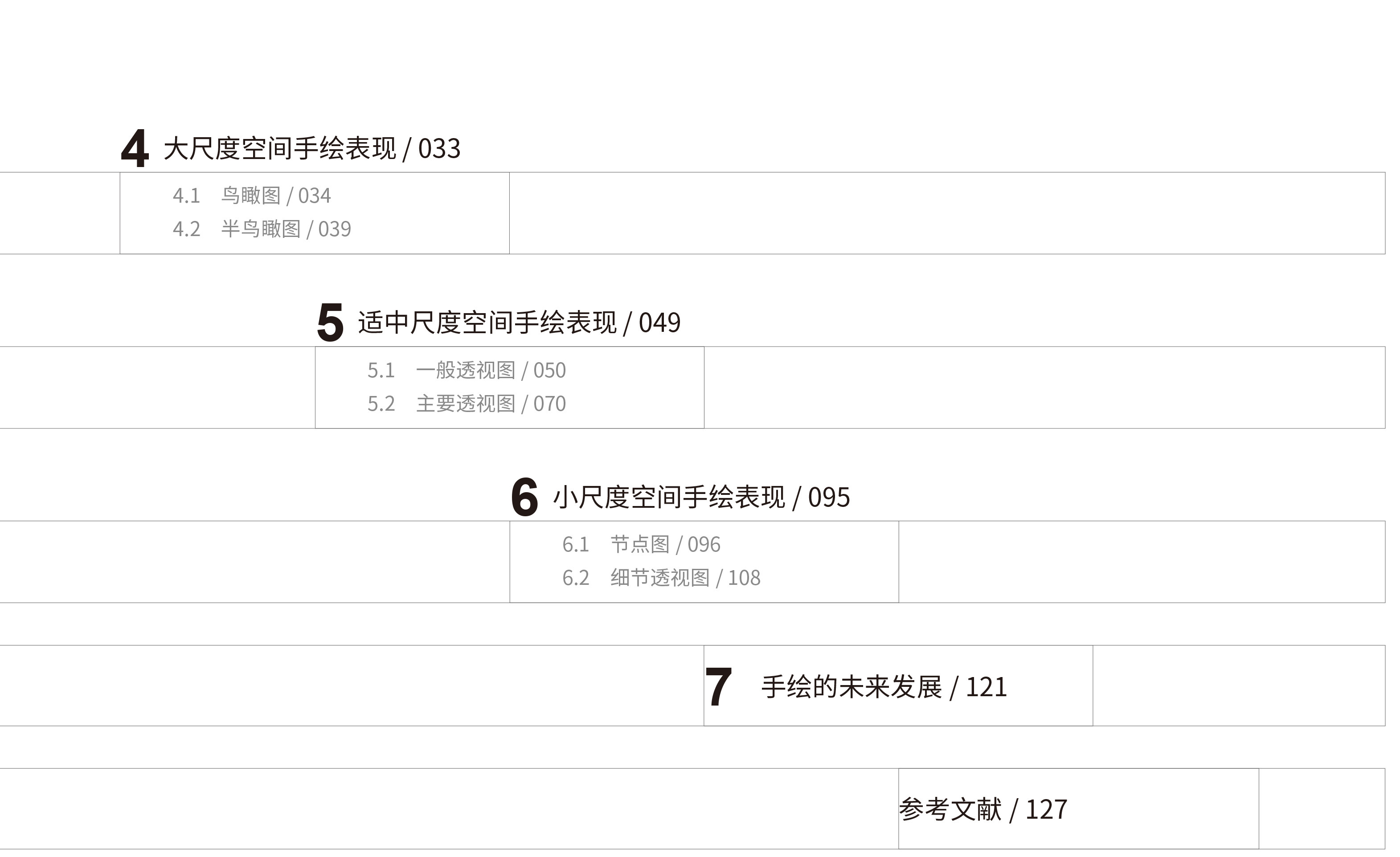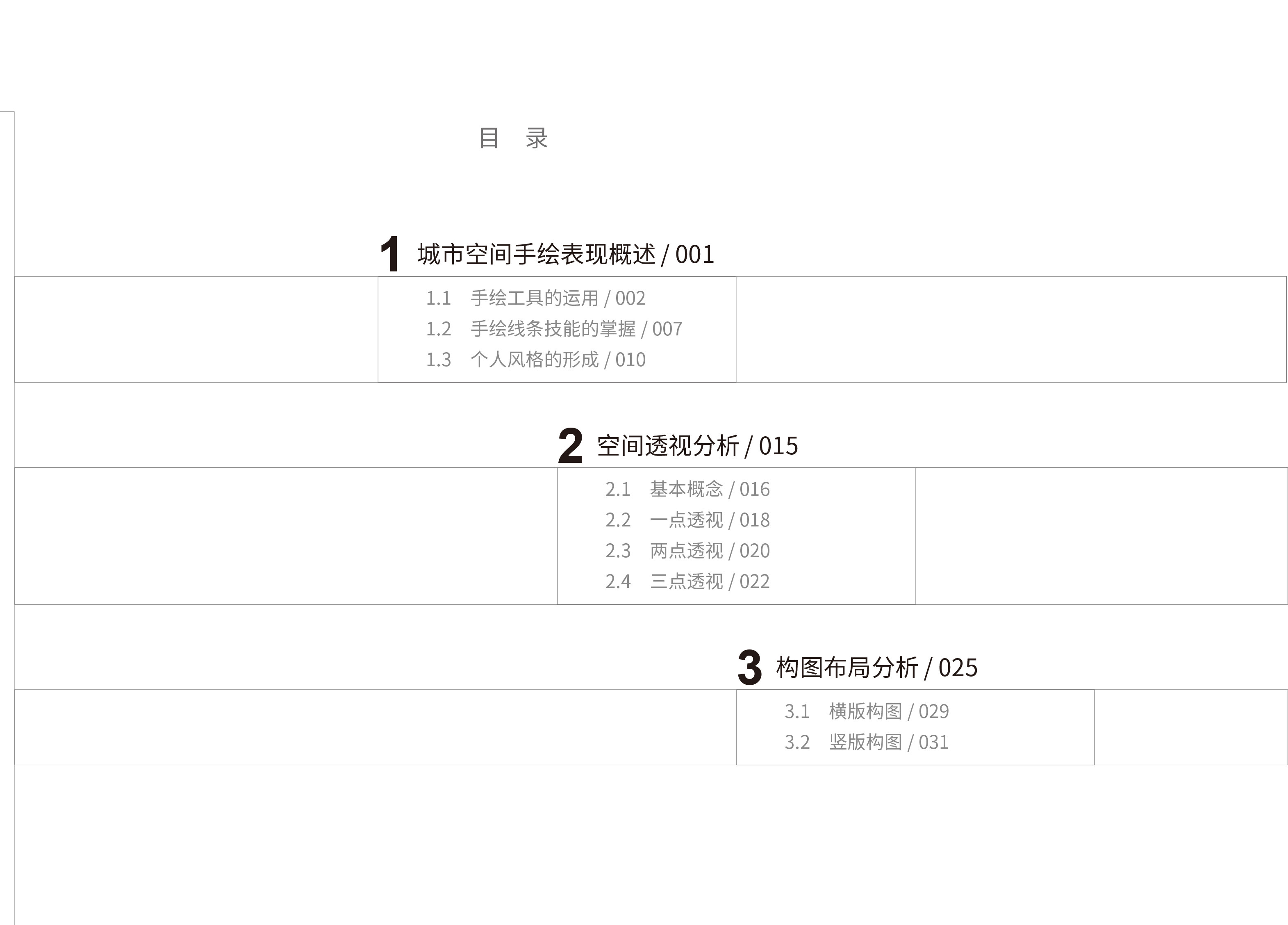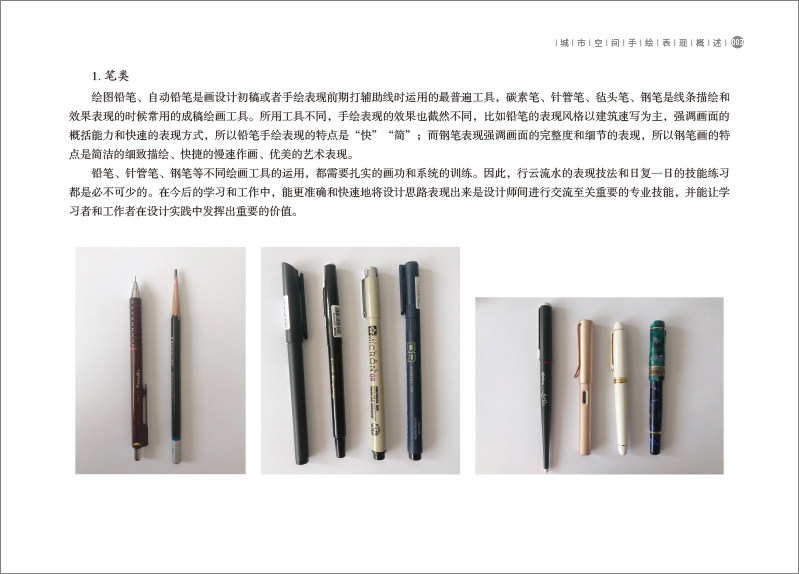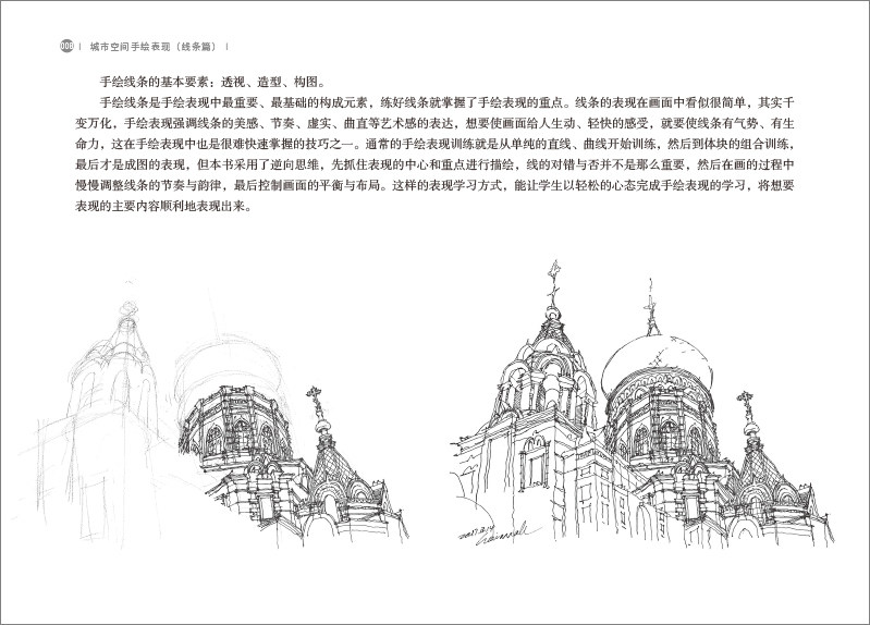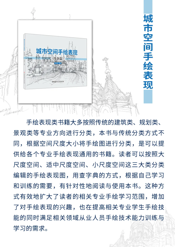 编者将传统的手绘训练分为两部分,本书为线条篇,另一本计划出版的书为色彩篇,有助于读者好线条和色彩进行针对性练习。手绘表现类书籍大多按照传统的建筑类、规划类、景观类等专业方向进行分类,市场有着大量的针对各个相关专业的分类图书,本书与传统分类方式不同,根据空间尺度大小将手绘图进行分类,是可以提供给各个专业手绘表现通用的书籍。读者可以按照大尺度空间、适中尺度空间、小尺度空间这三大类分类编辑的手绘表现图,用查字典的方式,根据自己学习和训练的需要,有针对性地阅读与使用本书。这种方式有效地扩大了读者的相关专业手绘学习范围,增加了读者对手绘表现的兴趣,也在提高相关专业学生的手绘技能的同时满足相关领域从业人员手绘技术能力训练与学习的需求。