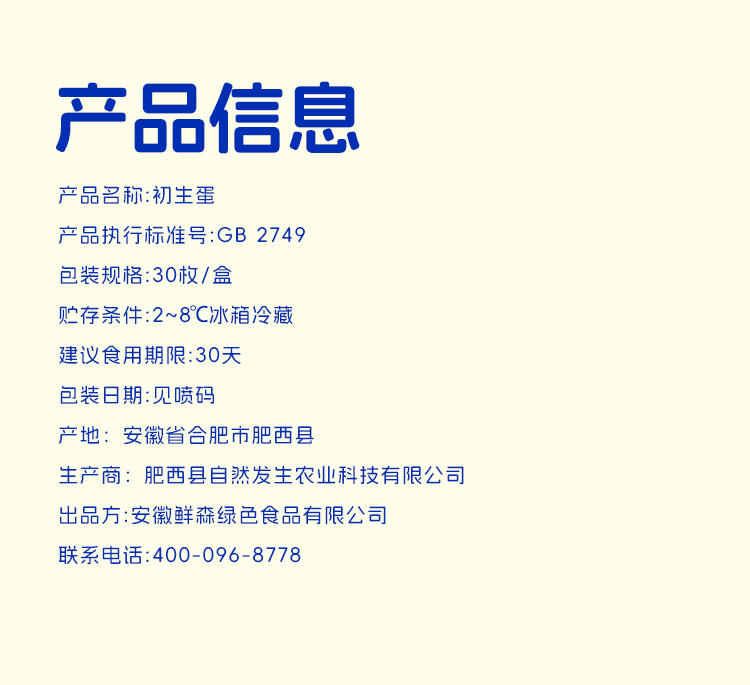 【品名】一年只卖一个月 限量2000盒 蛋鲜森金奖无抗初生蛋 蛋鲜森可生食土鸡蛋 顺丰/京东发 【规格】 土鸡蛋(可生食 1200g 30枚) 土鸡蛋礼袋装(可生食 1200g 30枚) 土鸡蛋(可生食 2400g 60枚) 初生蛋(不可生食 900g 30枚) 【产地】国内 【发货包装】独立包装盒 【发货地】安徽 【发货快递】顺丰、京东随机发 【不发货区域】新疆、西藏、内蒙古、宁夏、甘肃、青海、海南、黑龙江、吉林、辽宁、山西、港澳台 【发货时效】48-72小时,周末节假日顺延 【温馨提示】土鸡蛋可生食;初生蛋不可生食,需全熟! 【售后说明】 1、该产品属于食品类,不支持无理由退换货; 2、产品已经发出的情况下,不可更改地址,拒绝任何形式的拒签,收到产品后当场验货; 3、如出现异常情况,请带面单+产品拍照+产品包装照片与我们联系,我们会第一时间处理,如产品有质量问题可在收货24小时之内,联系客服进行售后; 4、留错地址、电话等信息导致货物不能正常送达均不在售后范围内; 5、因快递暴力导致产品品相不好,不影响食用,不在售后范围内不作赔付! |
