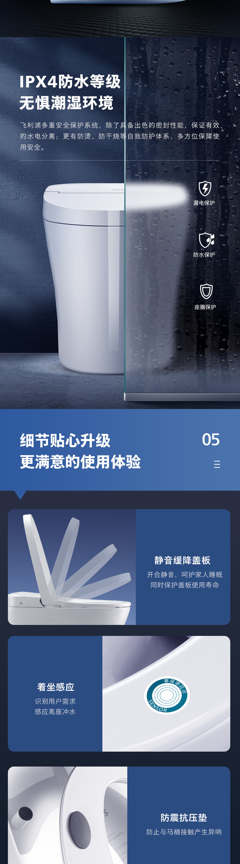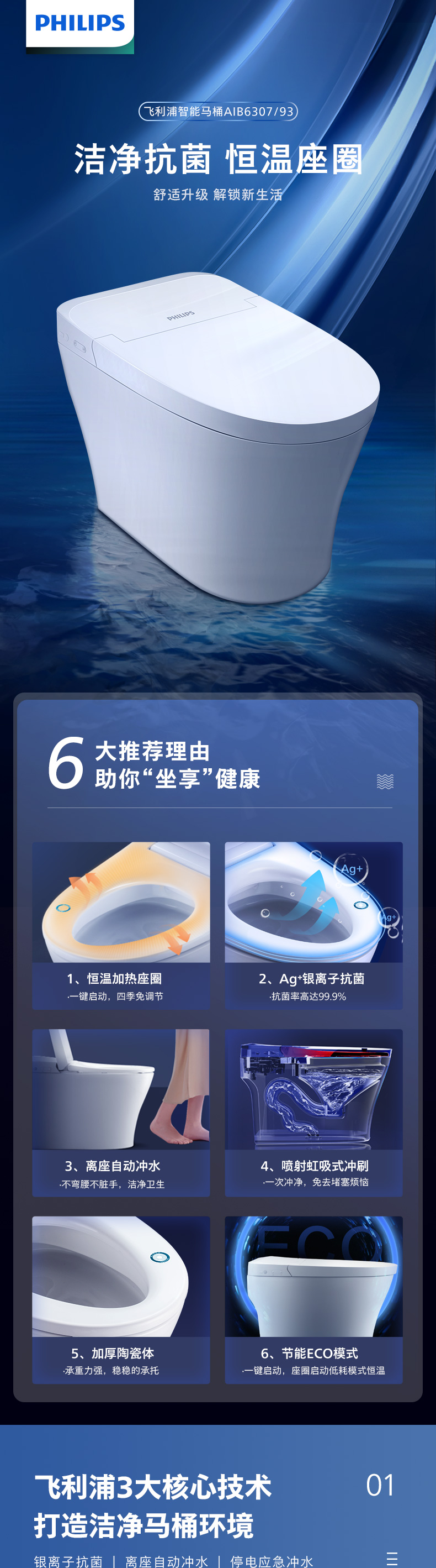 飞利浦(PHILIPS)智能马桶一体机抗菌恒温加热座圈 离坐自动冲水坐便器AIB6307/93