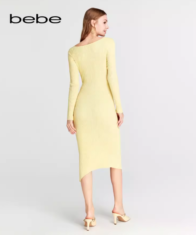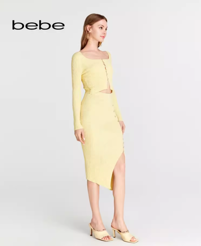 【2F】bebe2024春季新款女士钻饰镂空开叉修身针织连衣裙
