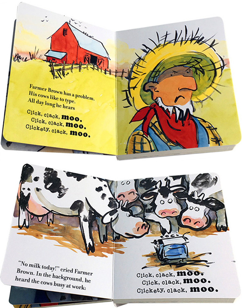 Click Clack Moo Cows That Type(会打字的牛)讲述了一个这样的故事:一天,Brown布朗的奶牛发现了一台旧打字机typewriter,于是乎,谷仓里传来了打字的声音——Brown布朗简直不敢相信自己的耳朵:奶牛竟然能打字!!!!