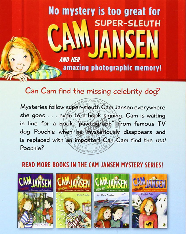 Cam Jansen是位小学生,她真正的名字是Jennifer,之所以得上这样一个“外号”,是因为她拥有一个神奇的能力,过目不忘,看过的任何东西就像照相机一样,所有大大小小的事情都能牢牢地烙印在脑海中,大家就开始叫她camera。久而久之,她的名字就变成了Cam。因为有了这个本领,Jennifer摇身一变成了一个小侦探。和她的好伙伴一起帮助身边的人破了不少案子,经历了许多冒险旅程。