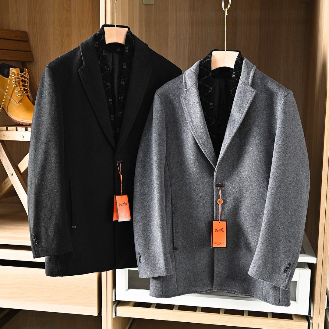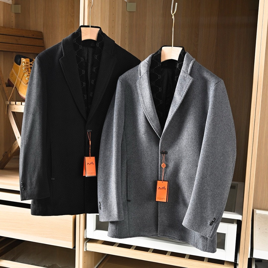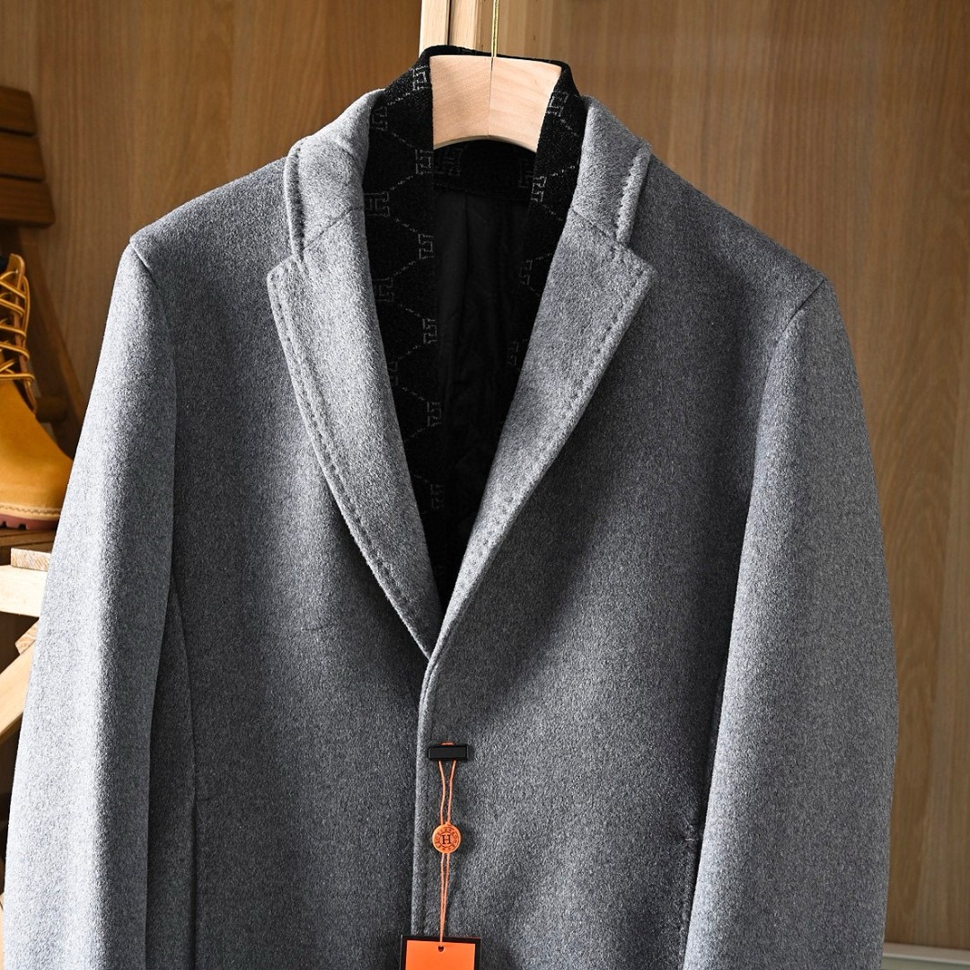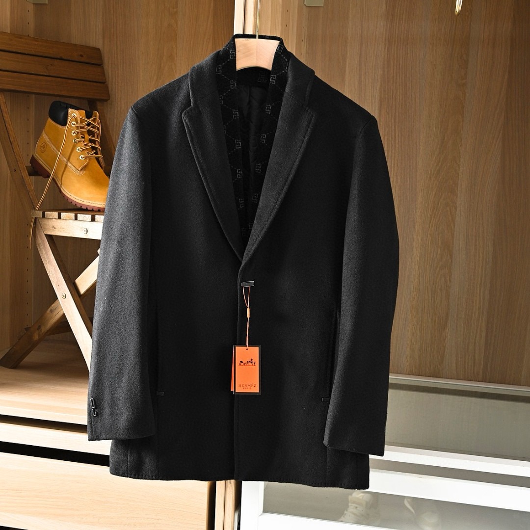 Hermes/爱马仕H家2025秋冬季加棉加厚商务休闲羊毛毛呢围巾中长款大衣外套