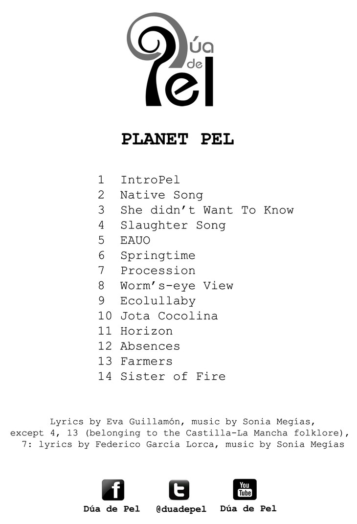 Planet Pel is a brave project, full of the strength of the feminine energy, of the telluric force of a planet Earth in danger of extinction. In its combination of music and poetry, this new work by Dua de Pel opens a breach in the inertia to carefully deposit a seed of consciousness. The songs, influenced by Spanish traditional music, intermingle with the poems along a walk to another place, to another planet, perhaps, by means of the polyphony of their voices, almost a capella, and the sincerity of their poems that are a mirror of that world that lag behind’s life in this timeless trip that is Planet Pel.