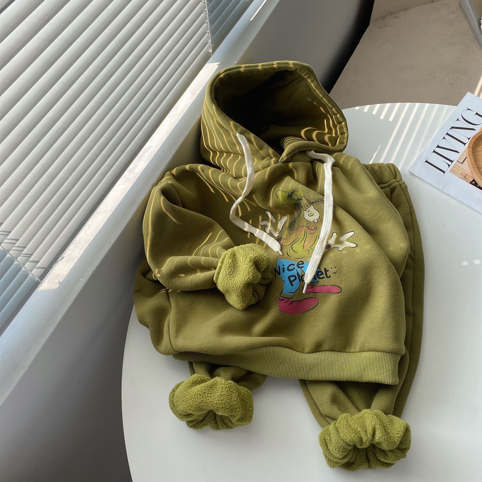 【母婴】儿童套装眯眯眼冬季新品男女童抓绒卫衣套装卡通纯色两件套潮