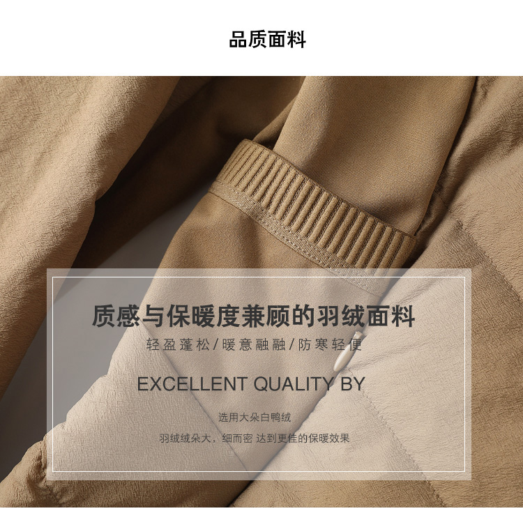 轻盈羽绒面料:专属面料在保证防寒轻便的同时,赋予了衣物整体的蓬松感
