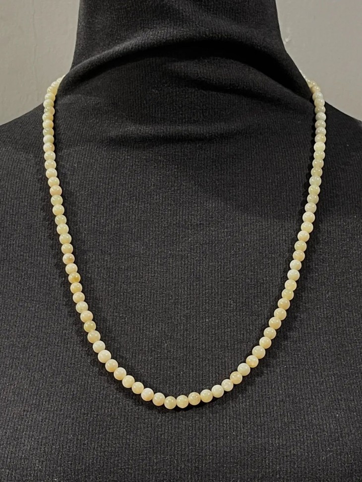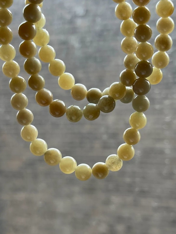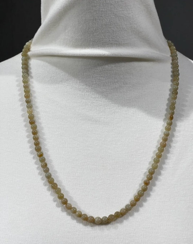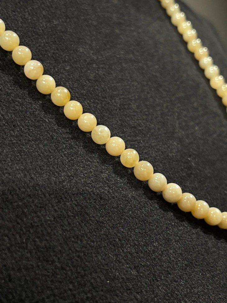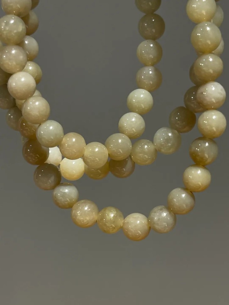 这是一组新疆和田糖料白玉圆珠108粒串成的长項链,天然新疆和田糖料白玉,质地坚硬温润,色泽柔美淡焦糖色,光泽亮丽不刺眼,细腻温润,粒粒皆是质地纯净的新疆和田白玉糖料圆珠。