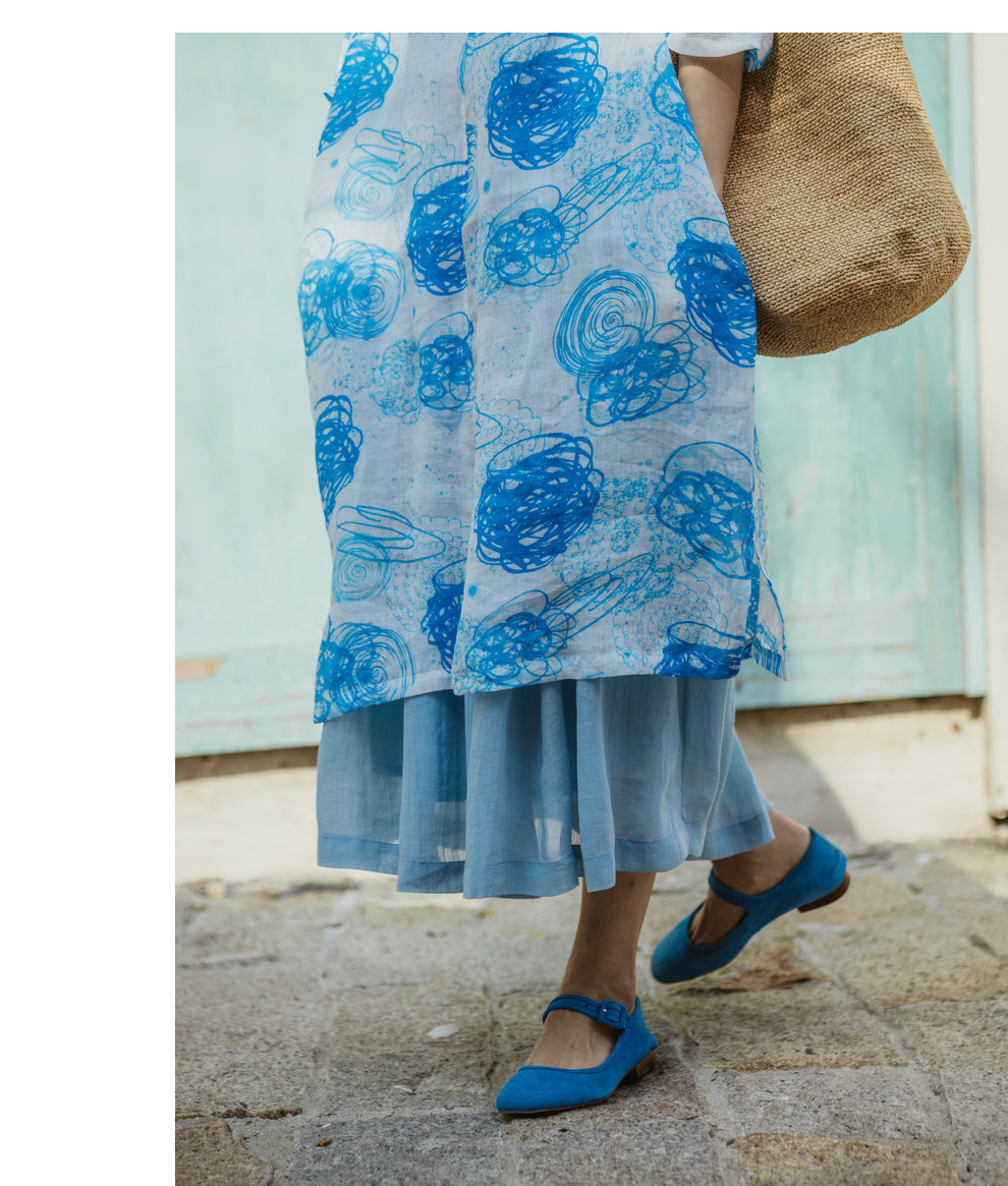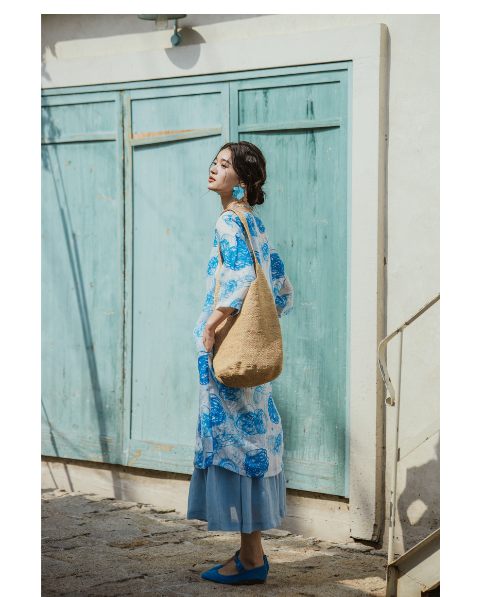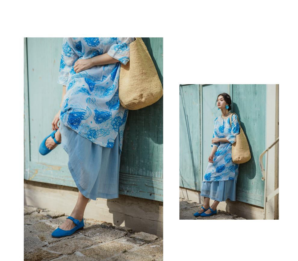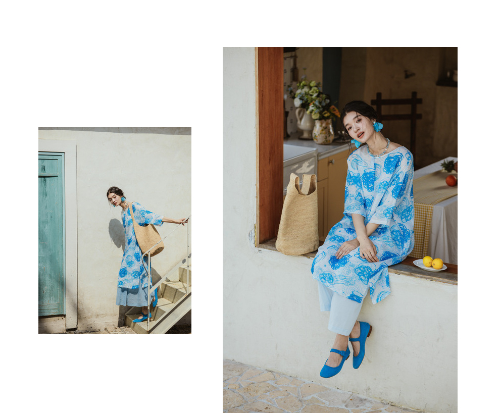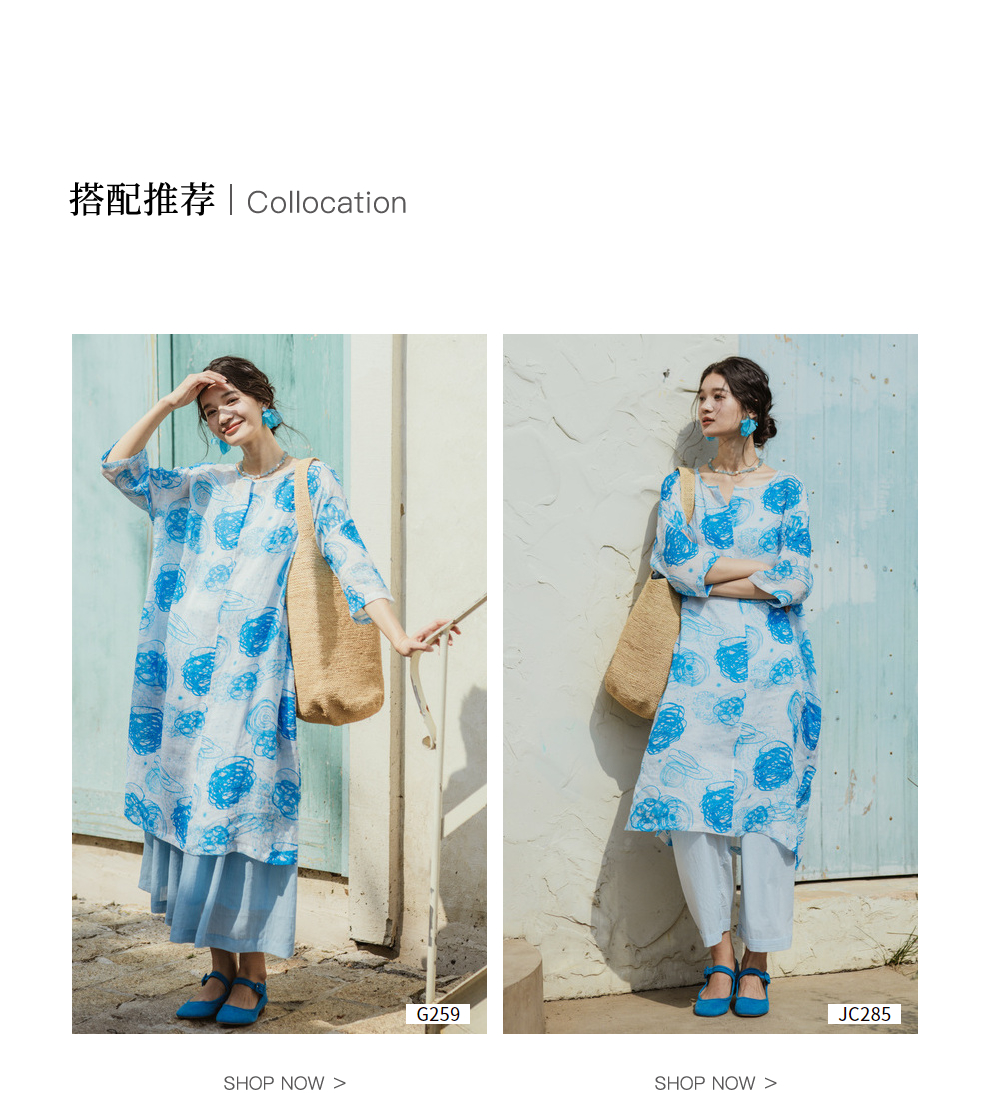 * 绽放379朵【入蓝系列】克莱因蓝高端亚麻印花圆领长款短袖连衣裙