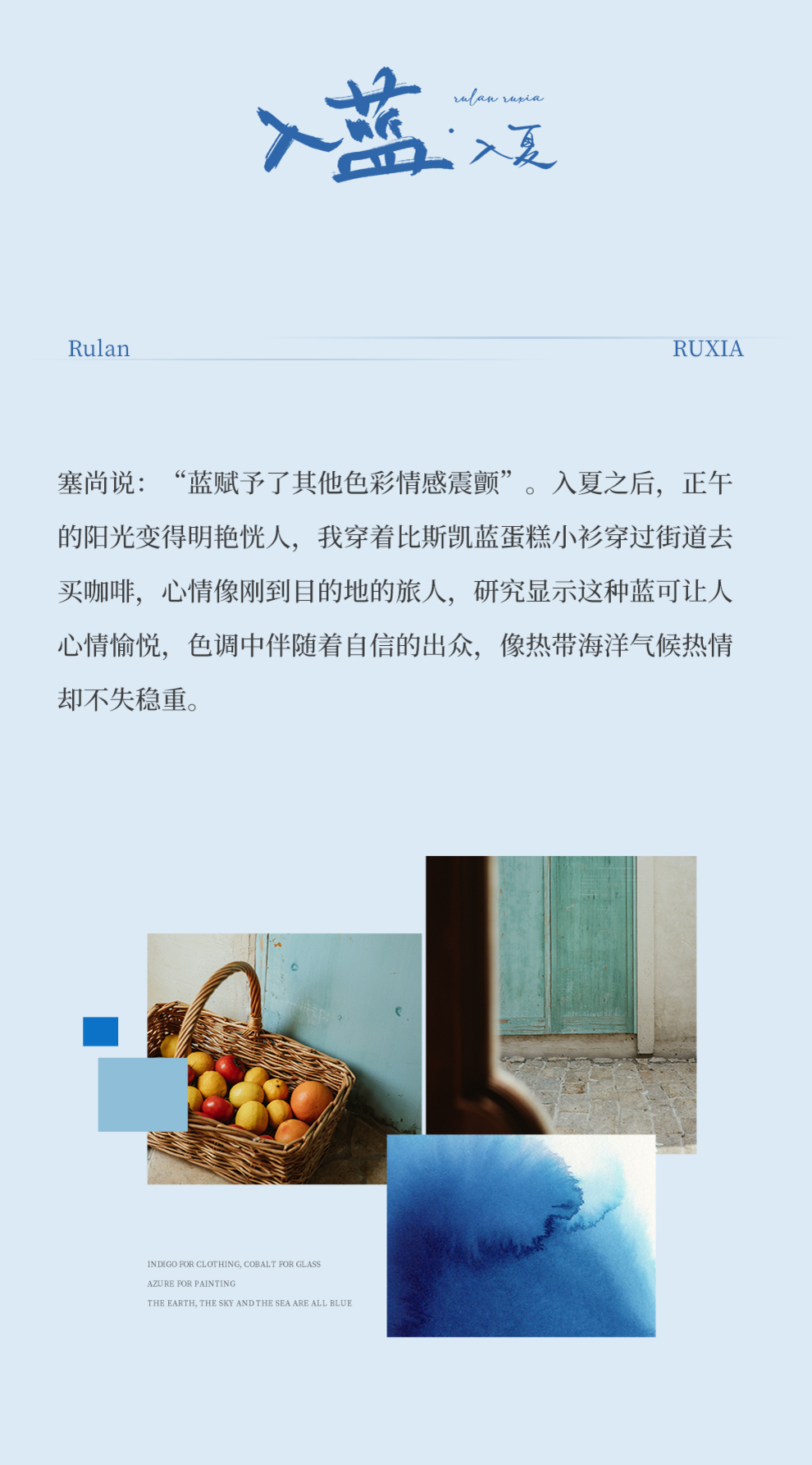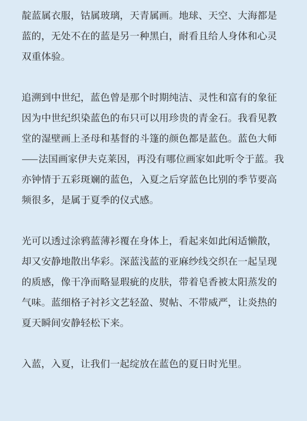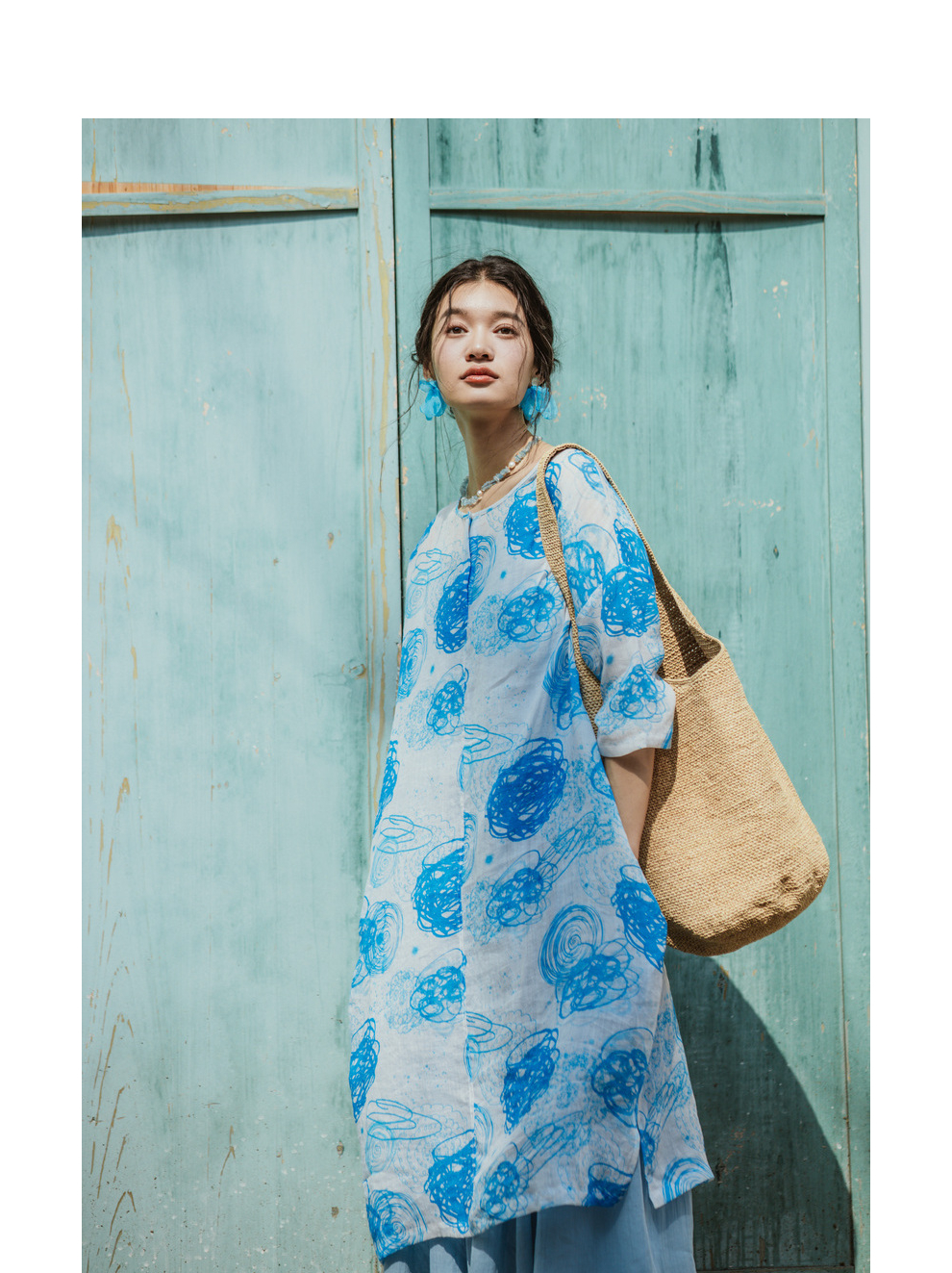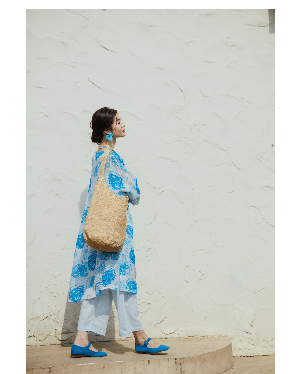 * 绽放379朵【入蓝系列】克莱因蓝高端亚麻印花圆领长款短袖连衣裙