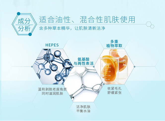 主要成分:氨基酸表面活性剂、两性表面活性剂、HEPES(羟乙基哌嗪乙烷磺酸)、洋甘菊和库拉索芦荟萃取物等