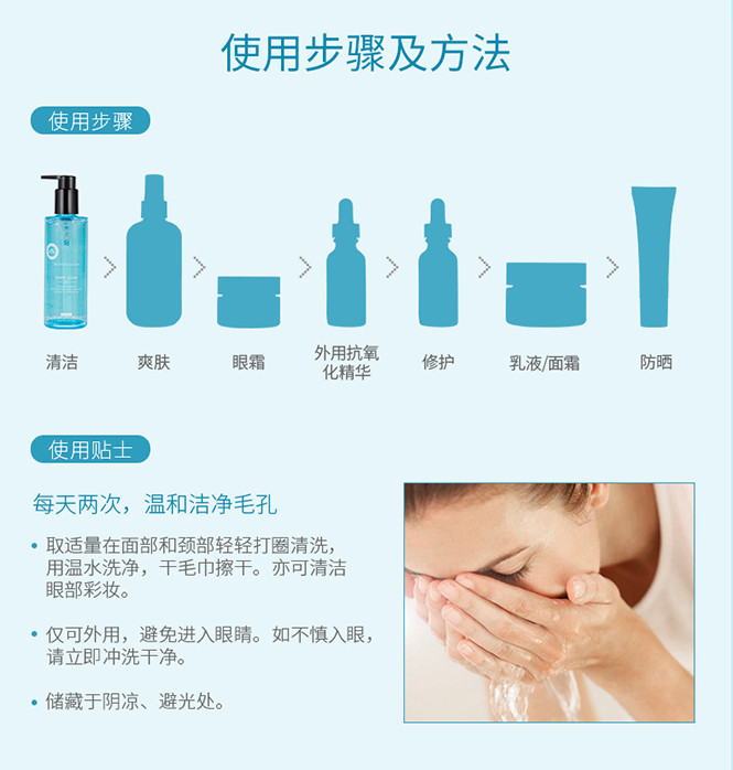 使用方法:打湿面部后,取适量在脸部和颈部轻轻打圈按摩,再用温水洗净