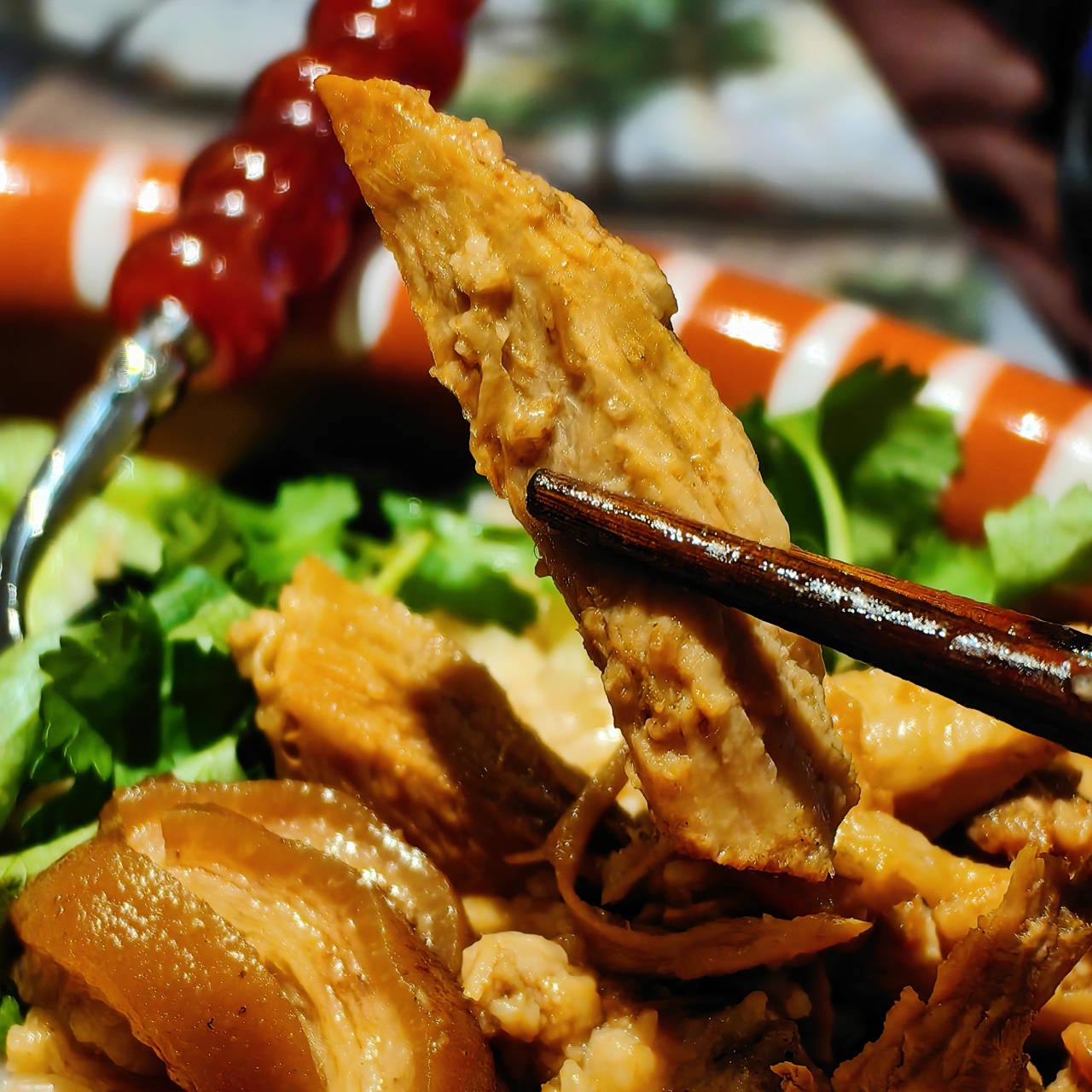 猪脚用的是惠来县农户家养的大肥猪,确保每一块猪脚都新鲜优质,而且只用猪大腿以下的肘子部位,潮汕人称之为“四点”,皮下仅有一层薄薄的肥肉,肥而不腻,紧紧裹住入味的瘦肉,内里还藏有软糯的蹄筋,是制作卤猪脚的上佳之选。配料表也是简单纯粹,均为日常烹饪常用调料,如香叶、八角、桂皮、陈皮、小茴香等,这些香料与中药材的巧妙结合,构成了隆江猪脚独特的卤料配方,它们不仅去除了猪脚的腥味,更赋予了猪脚丰富的层次感和诱人的香气!