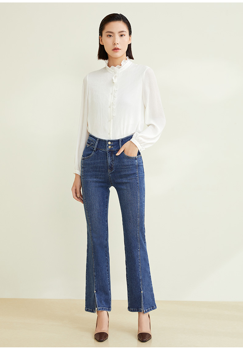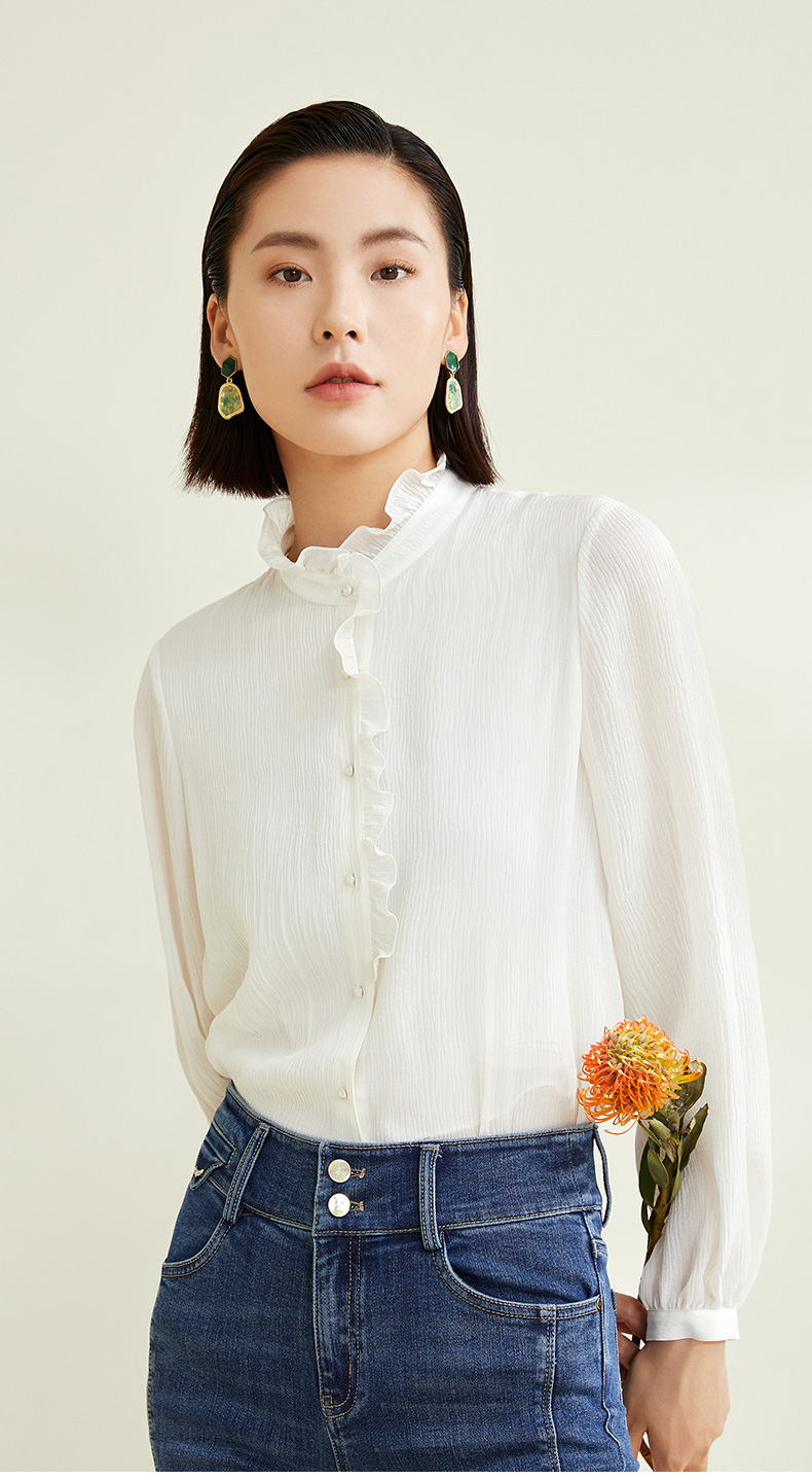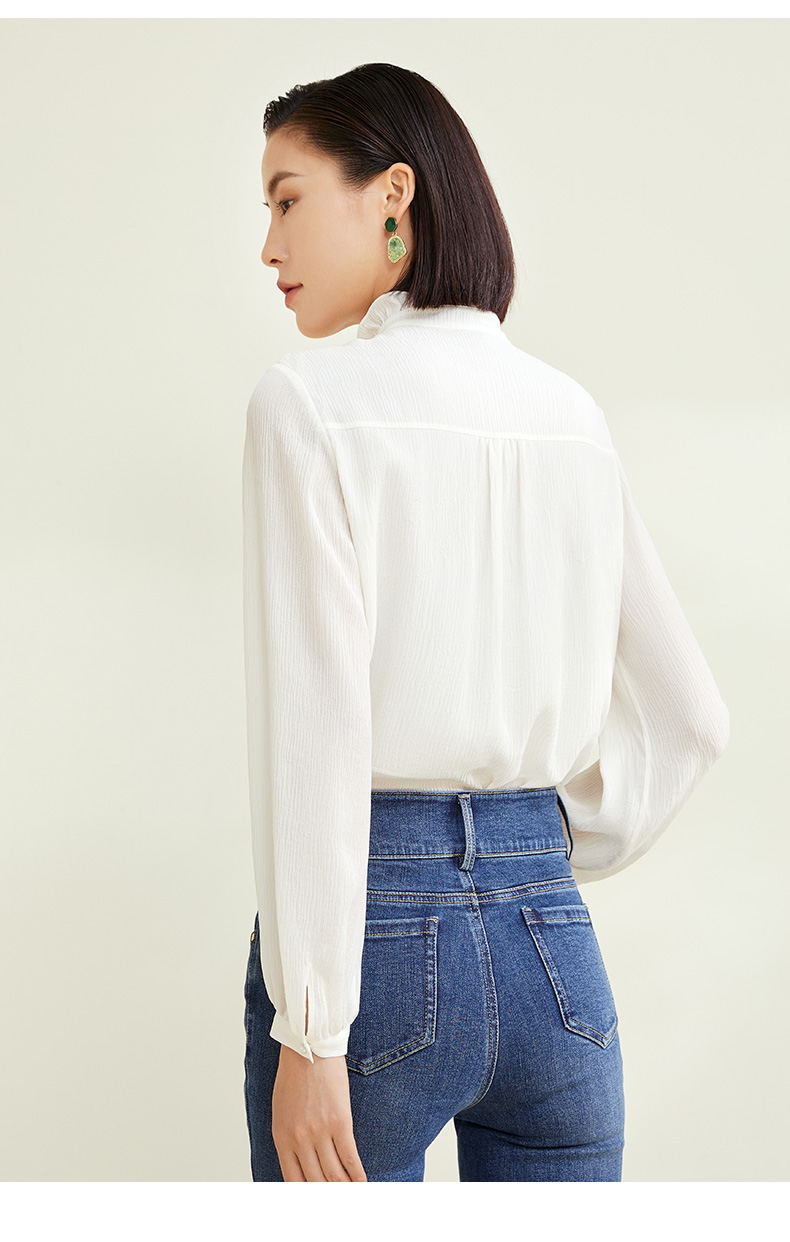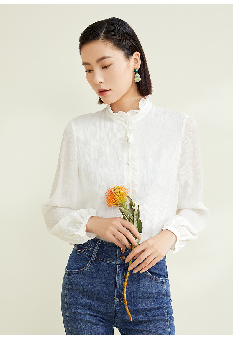 玳莎16mm顺于建宏绉木耳边立领真丝衬衫女秋季桑蚕丝别致洋气泡泡袖小衫 CC31310