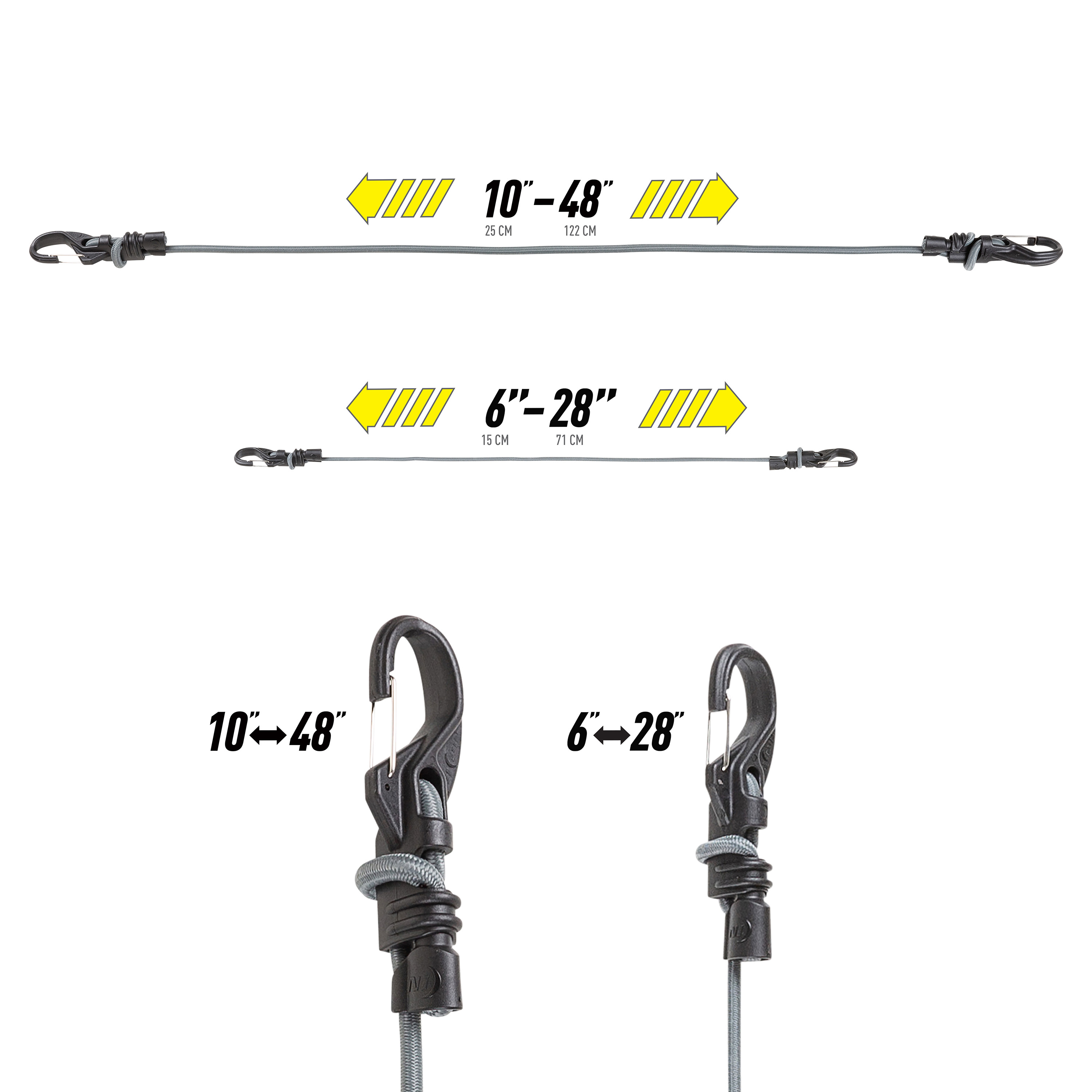 请勿应用于尖锐表面。挂钩应完全关闭,使用过程中注意保护眼睛,拉紧绳子时身体应避开绳钩意外脱落时的反弹方向。绳子拉伸长度不得大于原始长度的50%,过度拉伸会导致绳钩失控,对身体造成不必要的损伤。避免让儿童接触,请勿用于攀登。