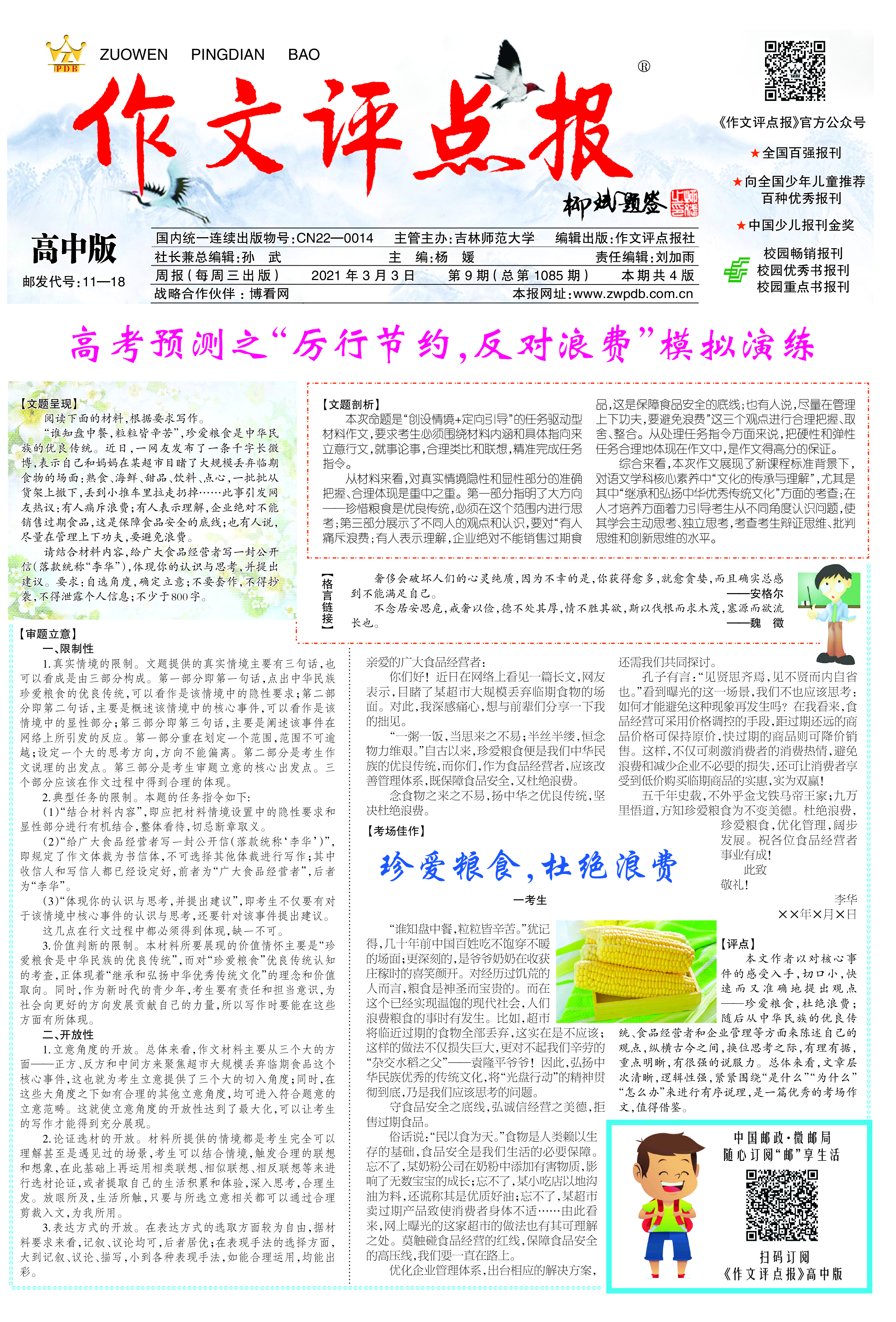 三、增值服务。订阅《作文评点报》,每月可获赠“作文支招”微课、作文素材包或中考、高考考前押题卷等,扫码获取。