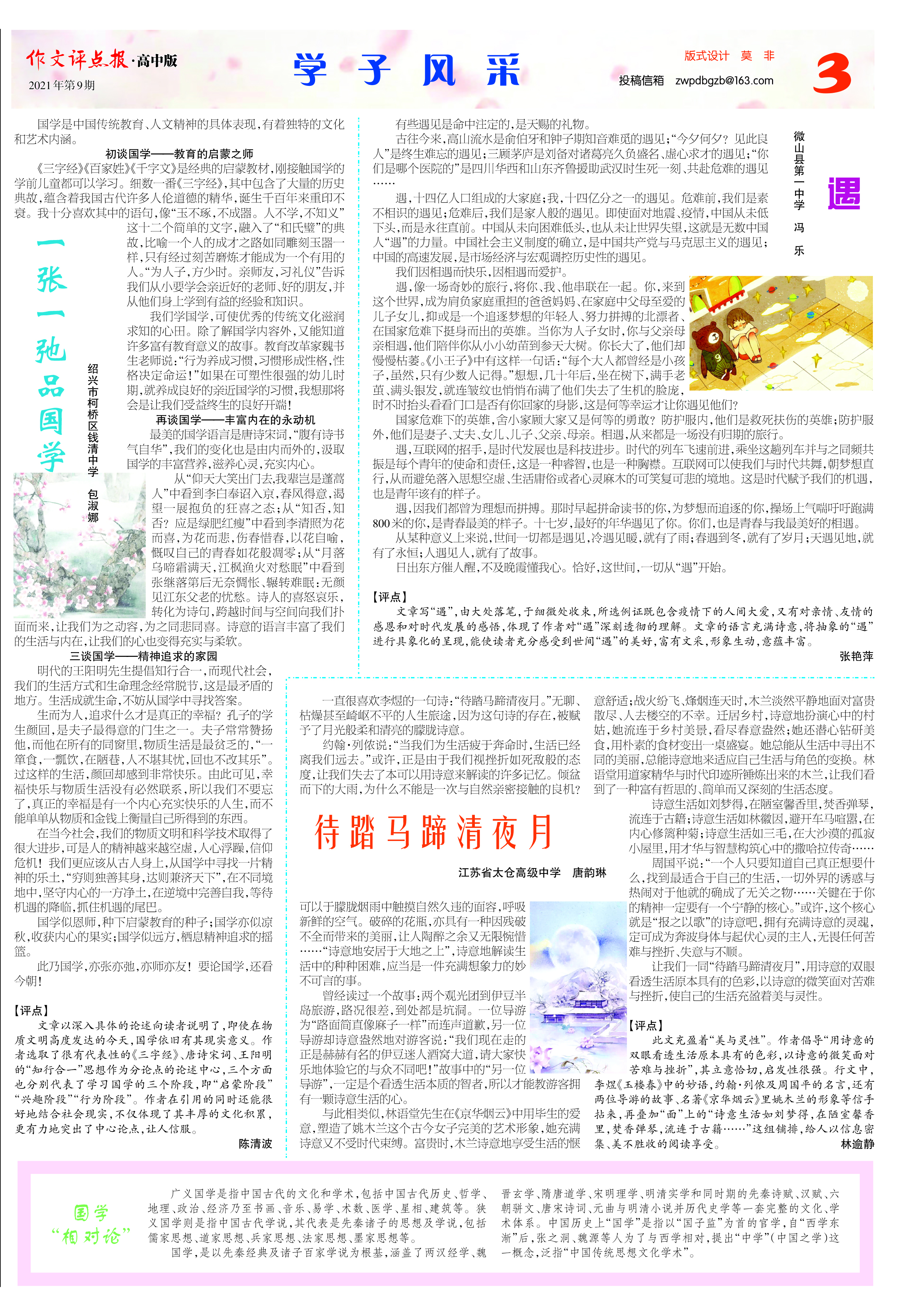 面向高中生,栏目丰富多彩,荟萃名篇美文,精选学生佳作,剖析失误作文,解析高考作文,指出提升空间;阐释高考热点话题,提供精品写作素材。