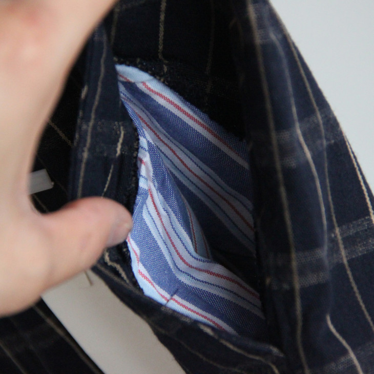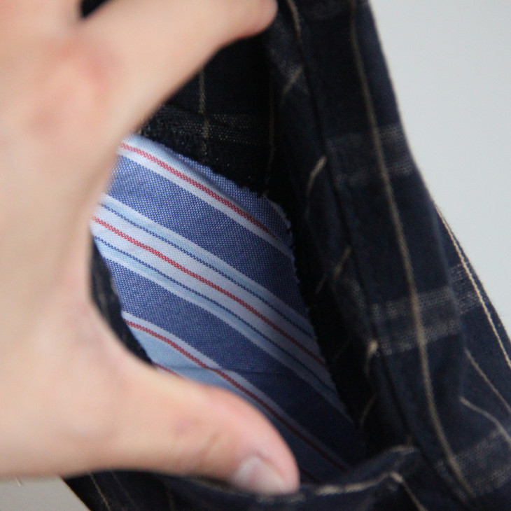 背面两套内挖的内包插袋,用以纽扣装订。 内层的口袋内衬布用了棉麻混纺的材质和大身面料做了镶拼。裤子里侧各自拼接了一条挂裤绳 细节精致到爆炸!