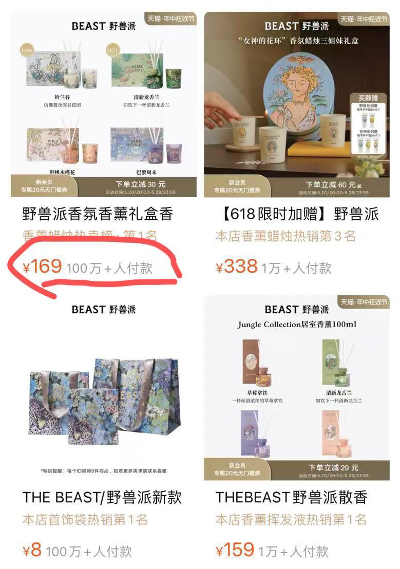 明星产品:产品由花艺、延伸至香氛、家居服、家纺、家饰、家具、珠宝配饰、美妆个护、家饰餐厨、跨境商品等,野兽派也从传奇花店成长为艺术生活品牌