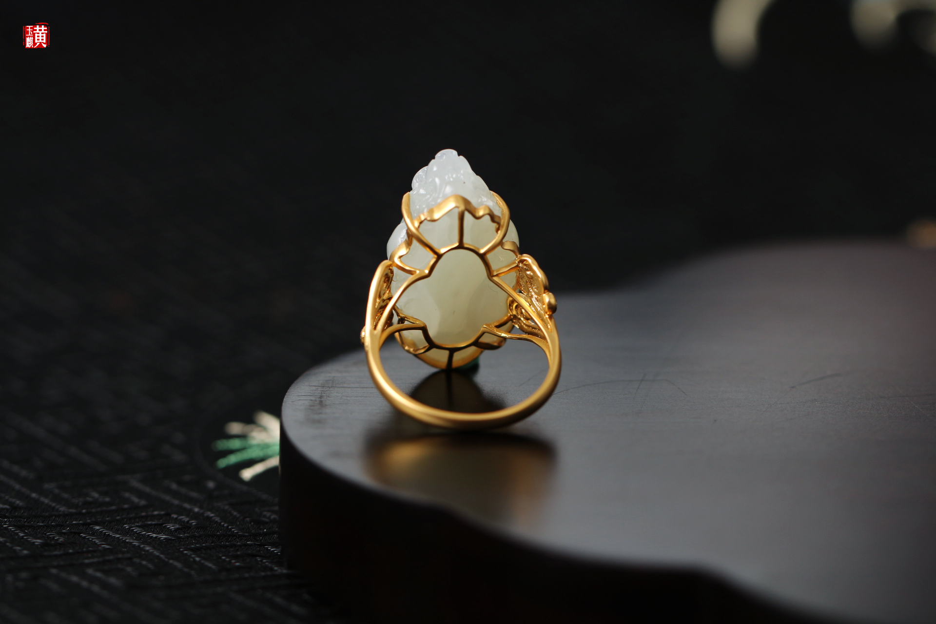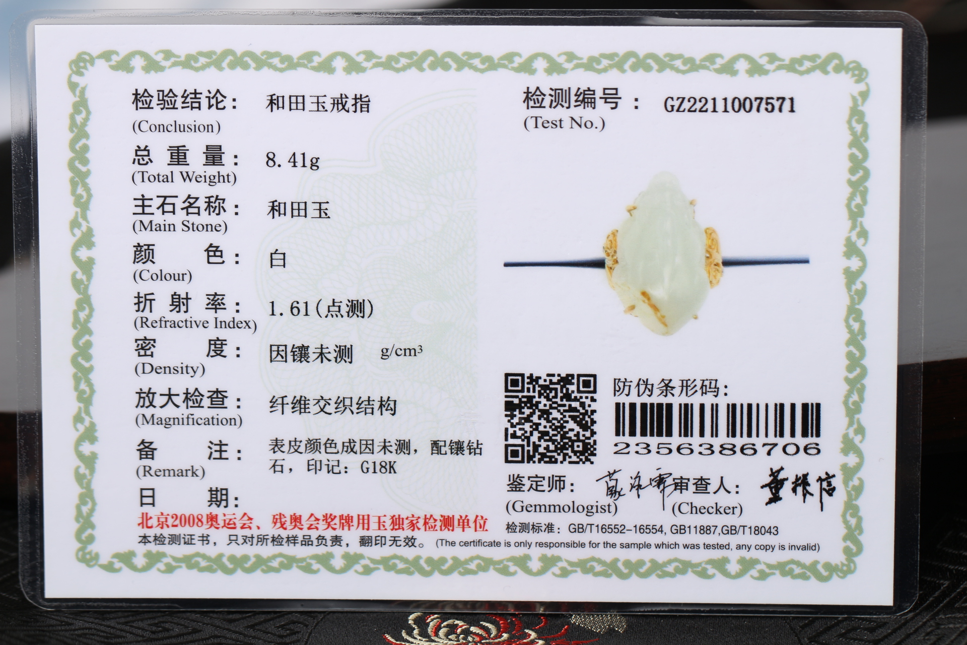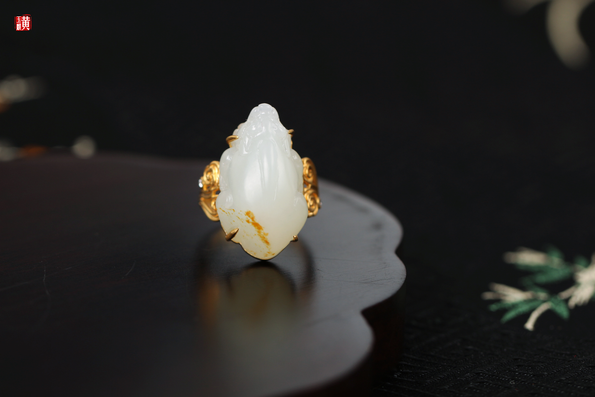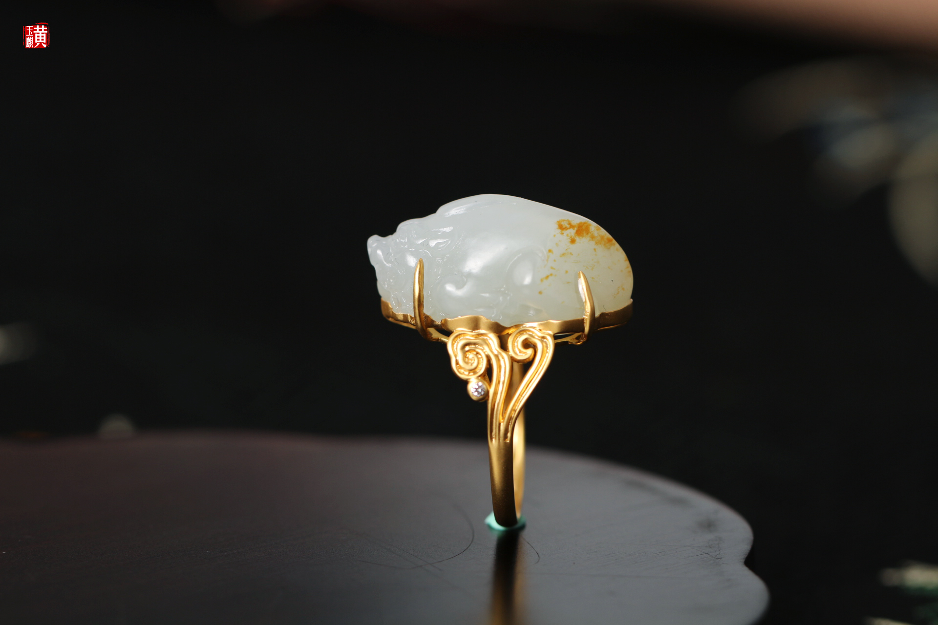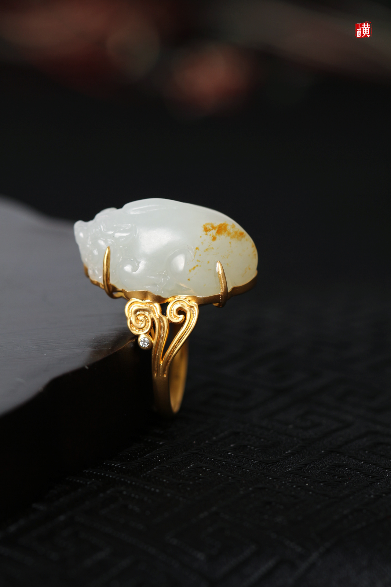 籽料貔貅戒指镶嵌:18K金伴钻赠证书克重:8.41g尺寸:24.3*14.7*13mm戒圈:14.5mm(可改)
