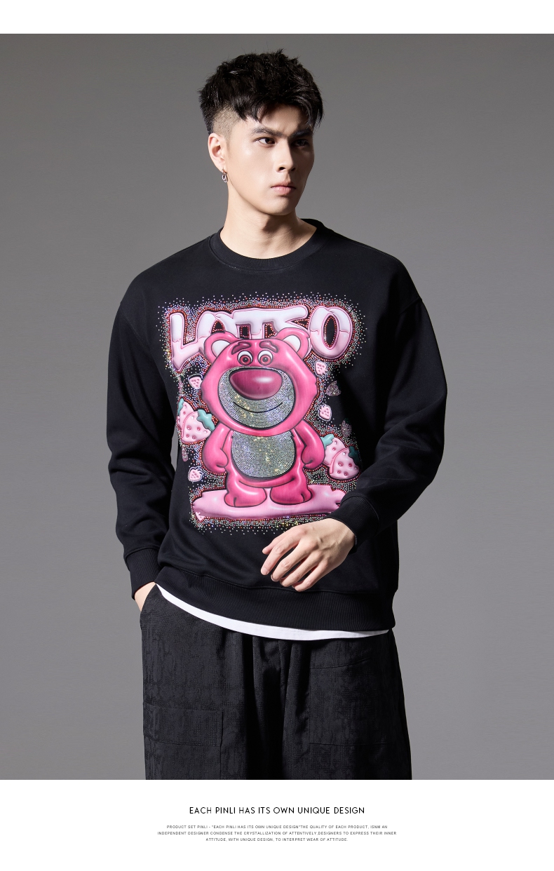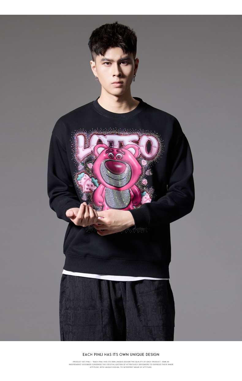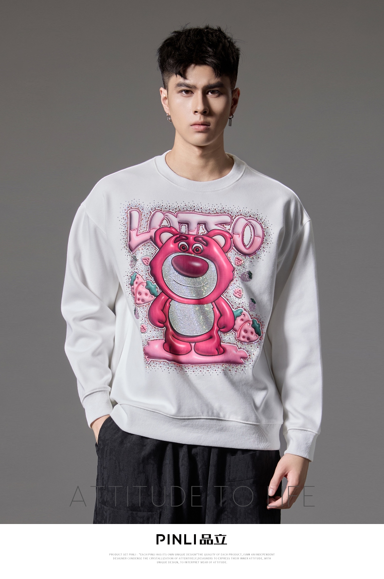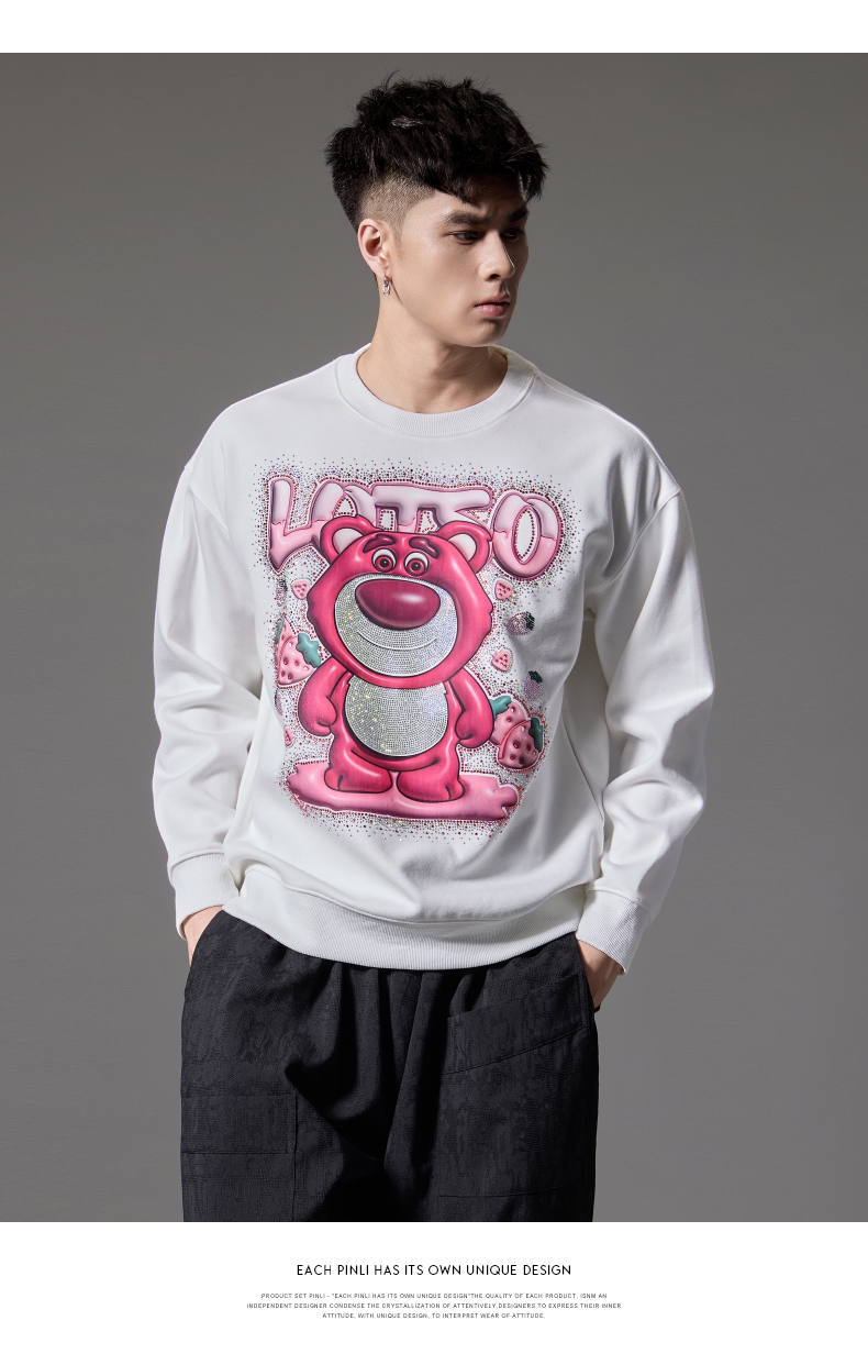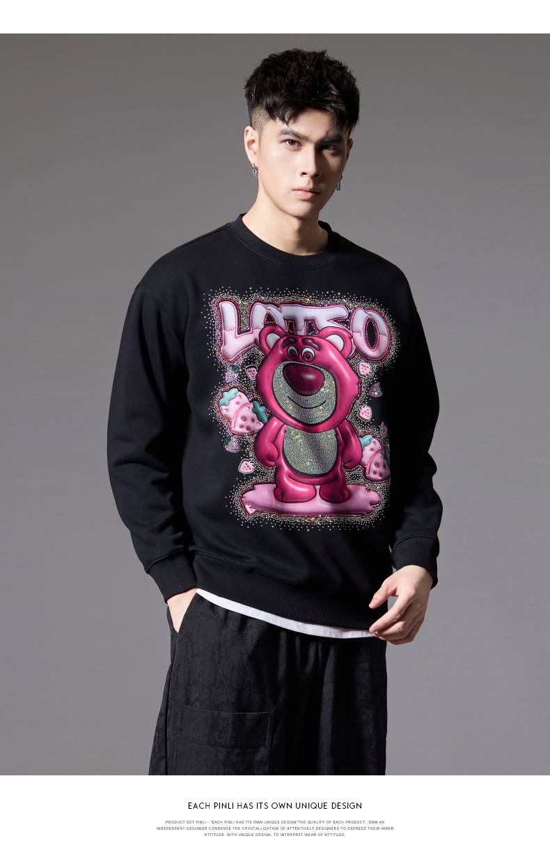 PINLI品立2024秋季新款男士潮牌休闲卫衣草莓熊烫钻宽松套头上衣BG243109013