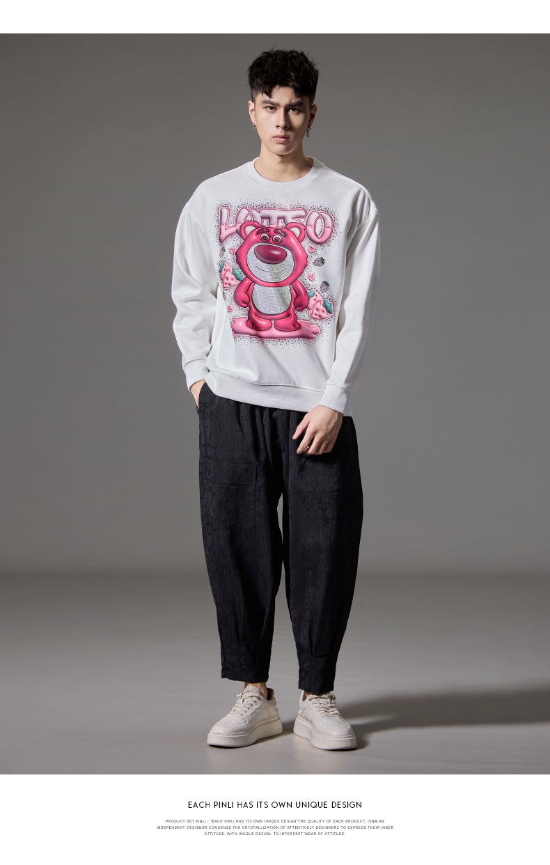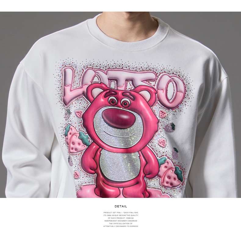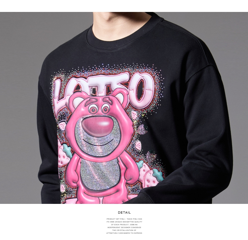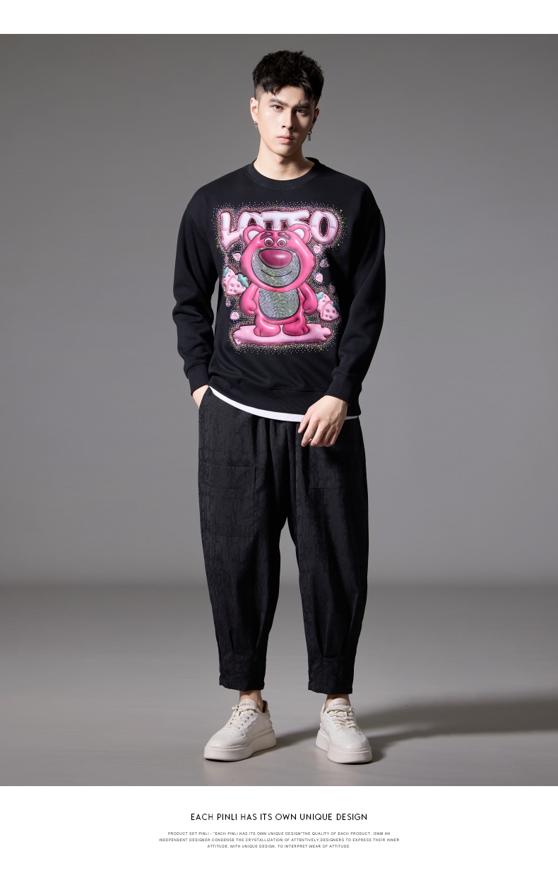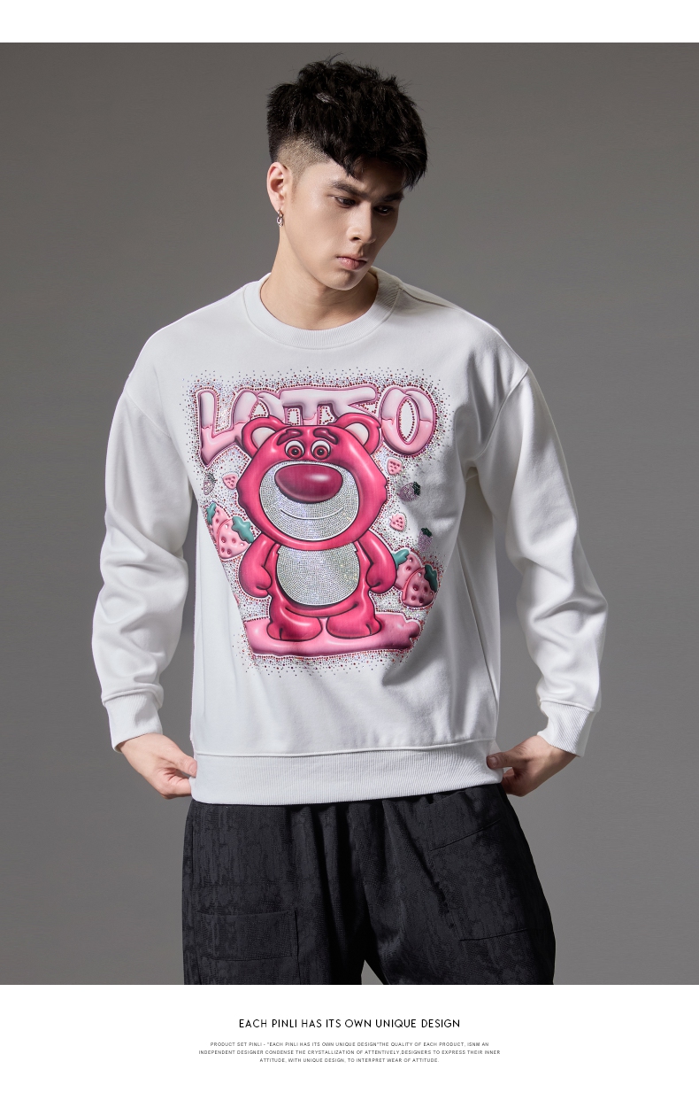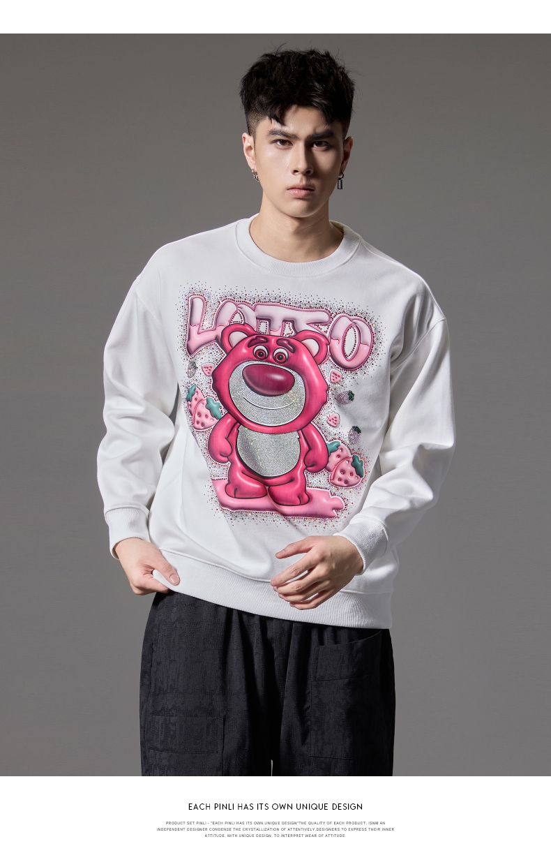 PINLI品立2024秋季新款男士潮牌休闲卫衣草莓熊烫钻宽松套头上衣BG243109013