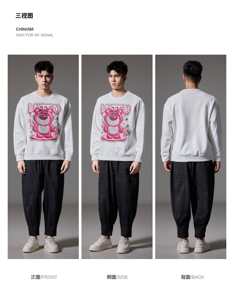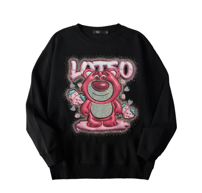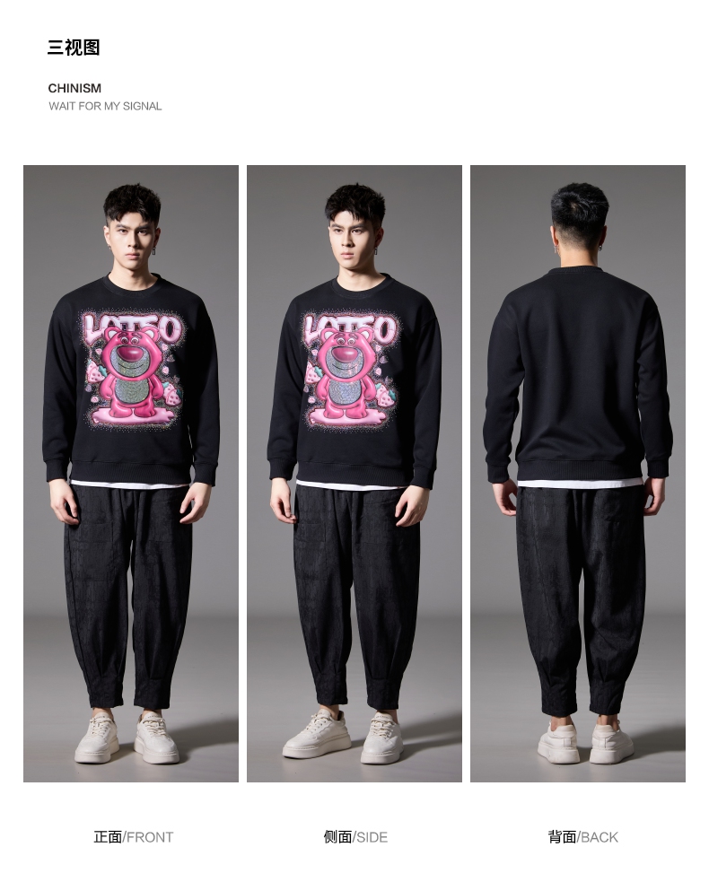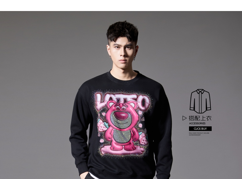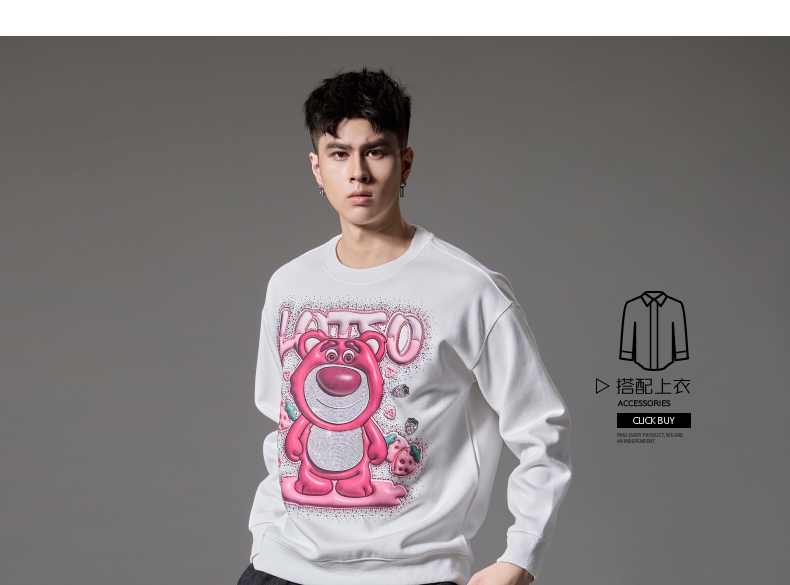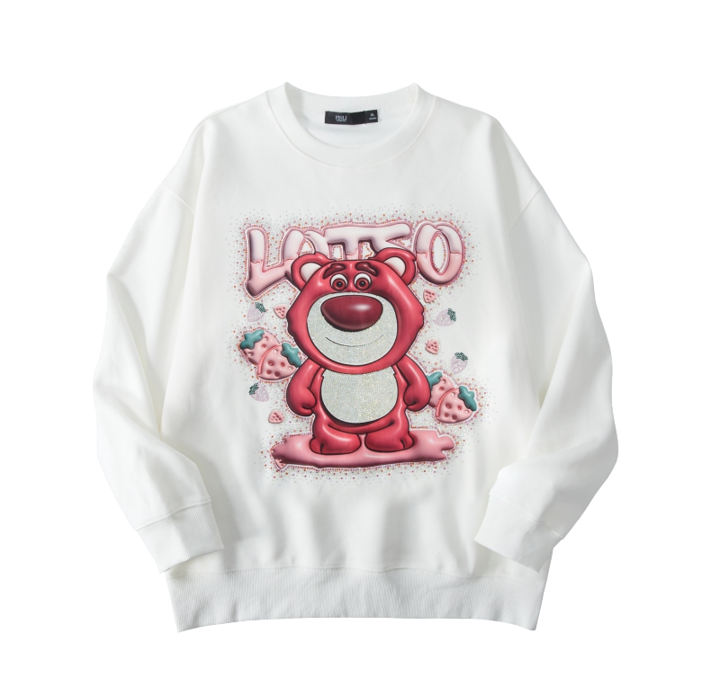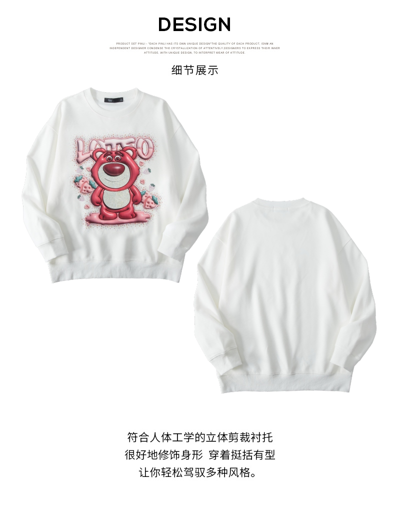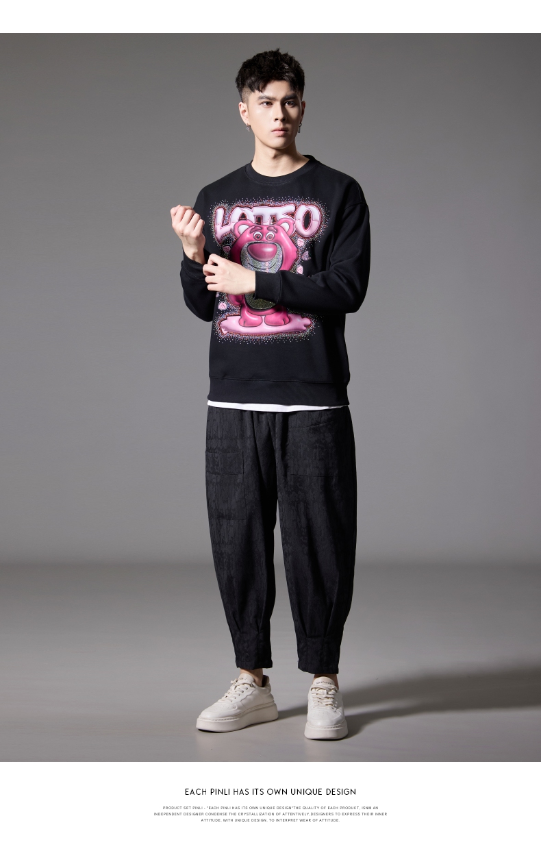 PINLI品立2024秋季新款男士潮牌休闲卫衣草莓熊烫钻宽松套头上衣BG243109013