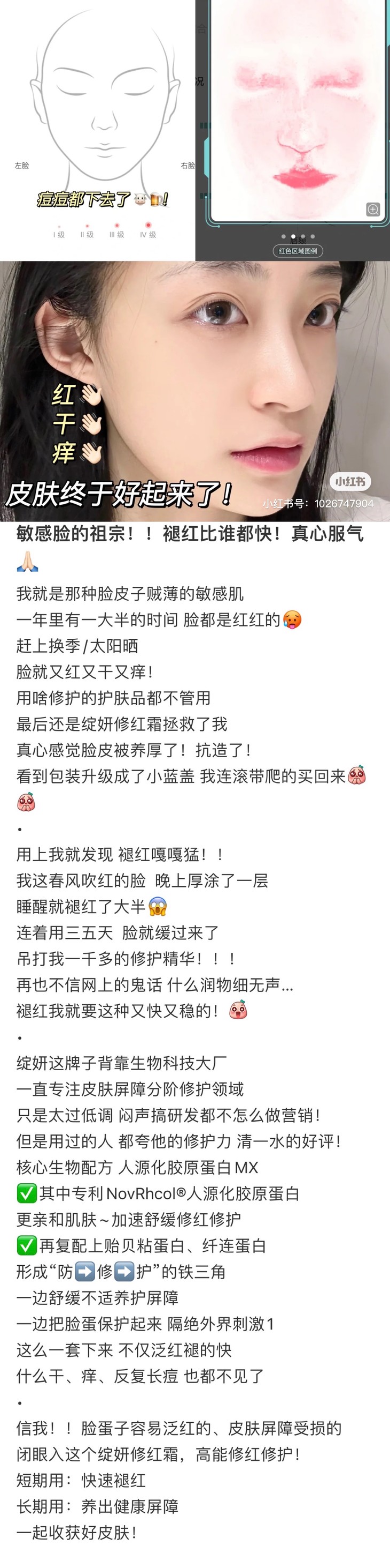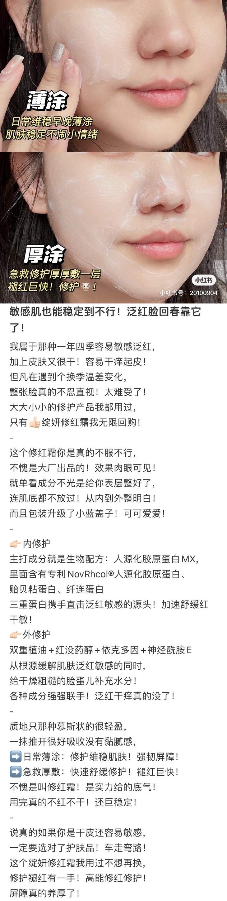 修红霜保湿力比较强的霜剂,还是蛮厚实的,不过使用感也很不错,易推开,肤感也很柔和,水水润润,小小一粒就能涂整脸。成分上很适合屏损肌和干敏皮,舒缓泛红、修护屏障、水油同补,可以作为日常面霜,搭配油浴也很不错!