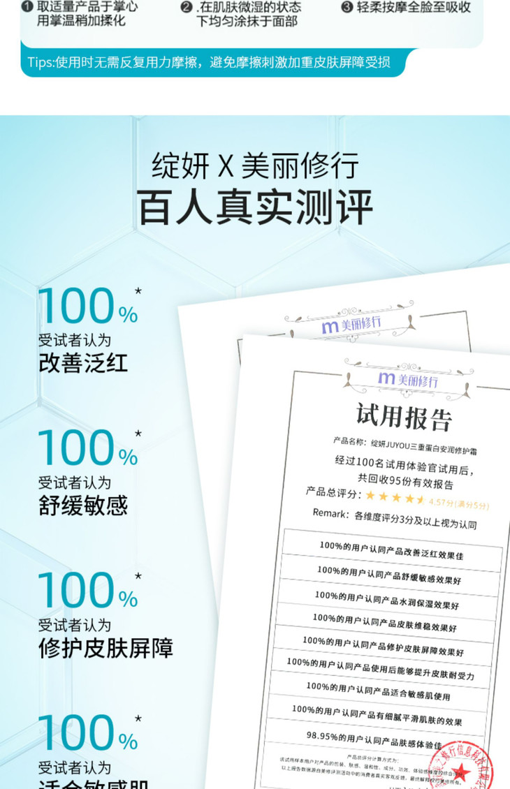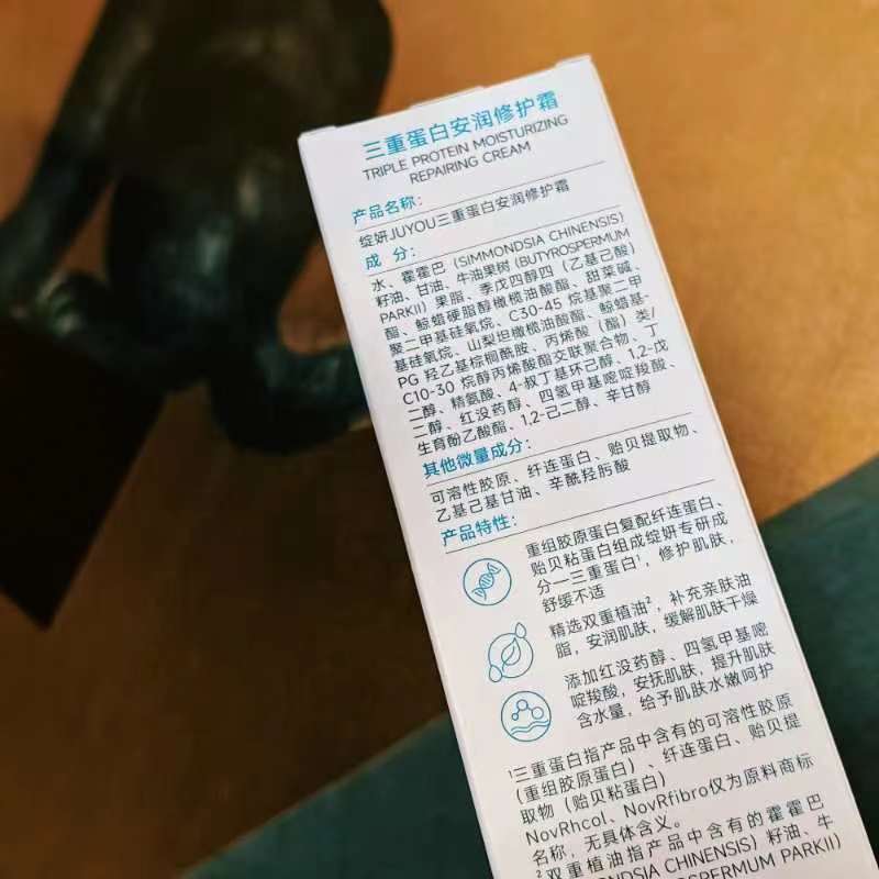 三重蛋白安润修护霜也被叫做修红霜,添加了NovTripro®人源化胶原蛋白MX,内修护外强化,以生物的力量从内加速屏障的自我修护力。同时,修红霜也是实打实地把保湿和舒缓退红成分加足了,4-叔丁基环乙醇 + 红没药醇,经典舒缓退红成分,强强联手,让泛红的脸蛋能尽快镇定。除此之外,还有保湿成分牛油果树果脂 + 霍霍巴籽油,让敏感肌舒服地锁住水分,才能筑起坚强的屏障。还做到了五大0添加:0尼泊金酯类防腐剂、0香精、0酒精、 0色素、0激素,配方精简安全,敏感肌也能放心用!