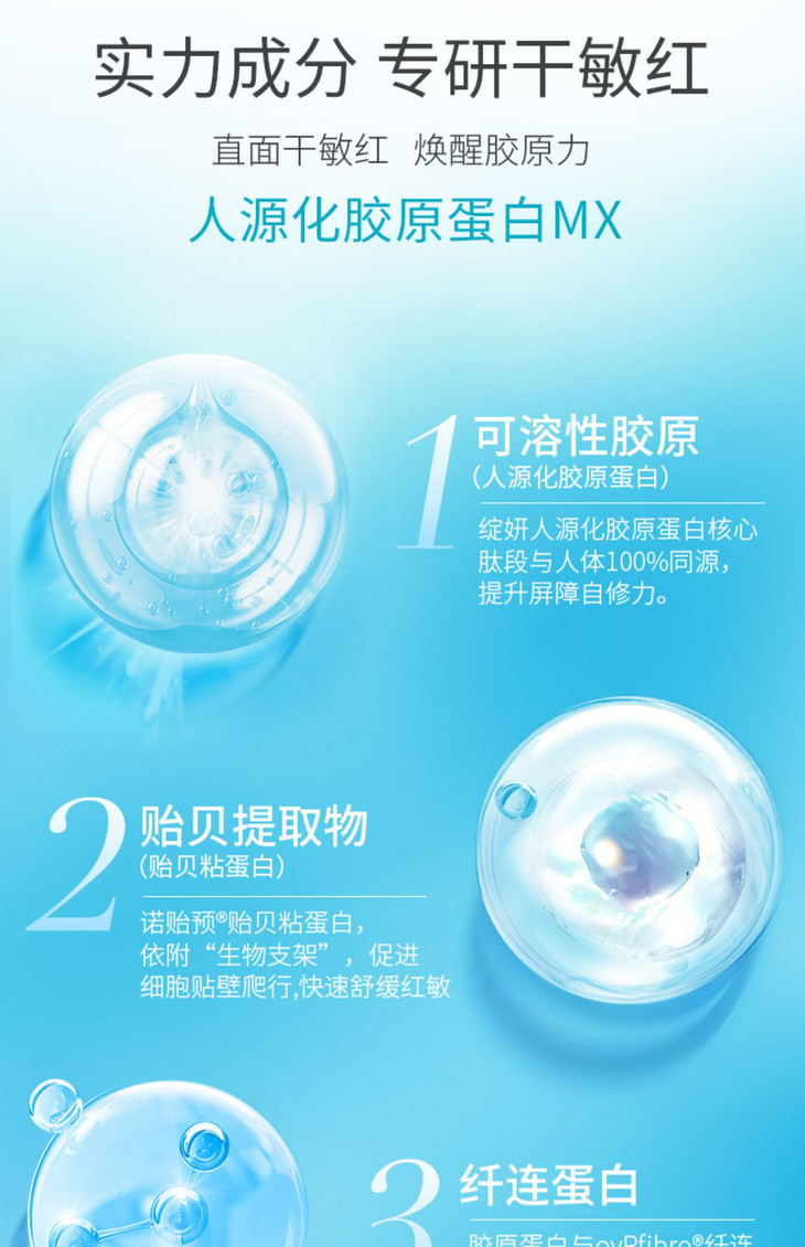 绽妍是一个专注于皮肤屏障修护的实力品牌,基于2大基因工程研发平台,以NovRhcol®人源化胶原蛋白、NovRfibro®纤连蛋白、诺贻预®贻贝粘蛋白为核心成分,专研科技配方NovTripro®人源化胶原蛋白MX,并获得国家专利。该成分可调节细胞极性、分化和生长,纤连蛋白还广泛参与细胞迁移、粘附、繁殖、止血及组织修复等过程,诺贻预®贻贝粘蛋白特有的促愈修护功效,对屏障建立帮助很大。