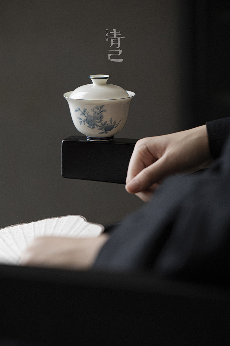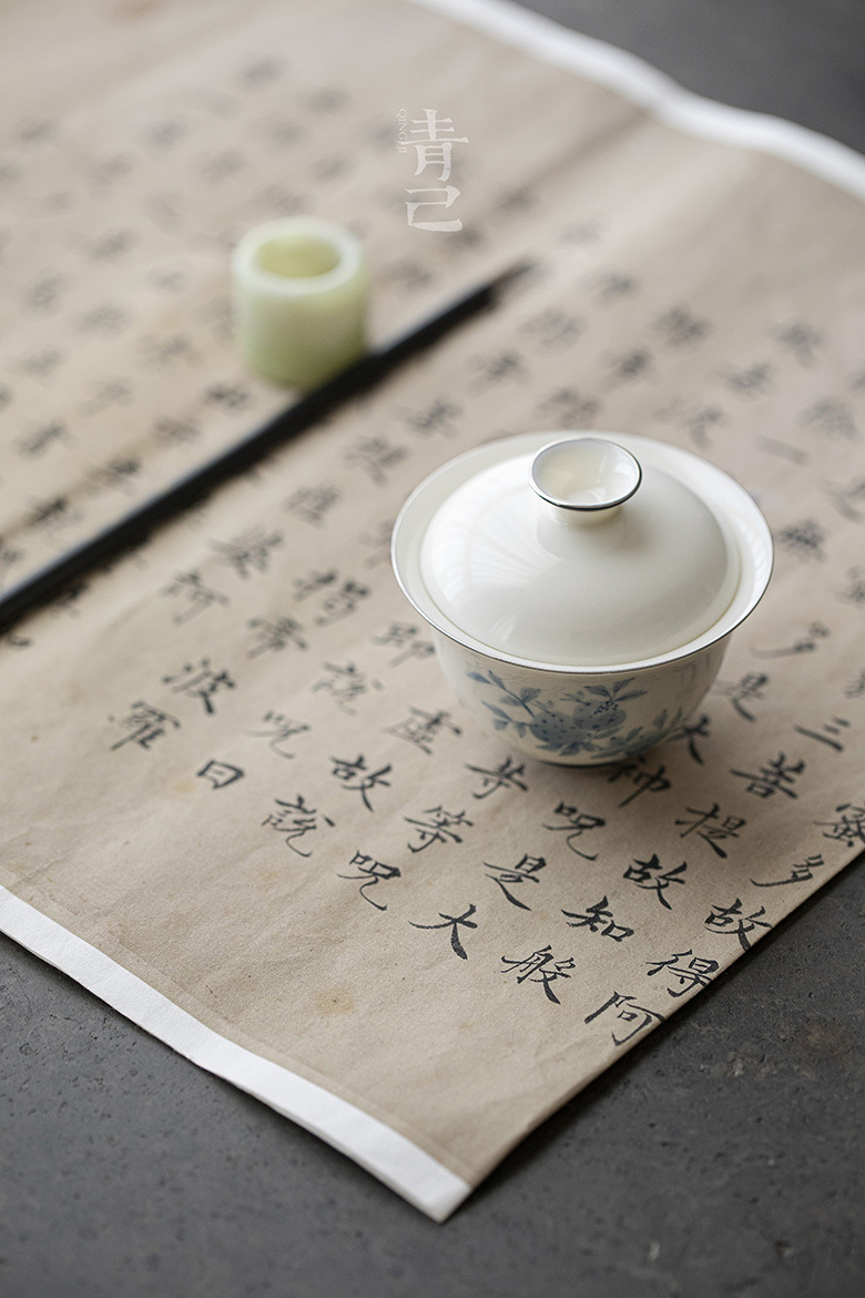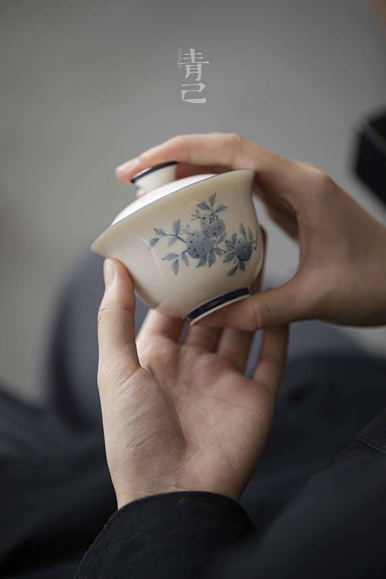 永利汇玉泥白瓷手绘青花石榴盖碗家用文人茶器陶瓷釉下彩泡茶碗中式创意