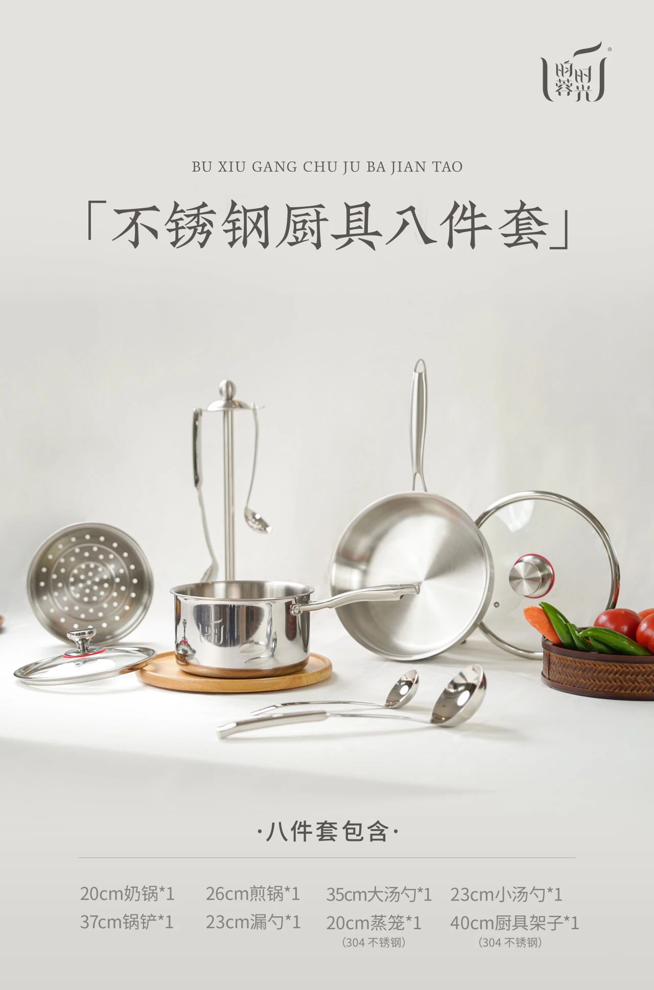 【昀蓉·定制周边】316L不锈钢厨具八件套(煎锅+奶锅+蒸笼+锅铲勺四件套)不易腐蚀耐高温,高抗菌率,导热迅速,受热均匀,坚固不易变形