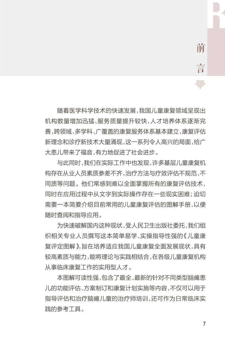 1. 主要内容包括发育能区功能障碍评定、儿童其他常见功能障碍评定、儿童常见疾病评定等。评定分类具有条理性强,逻辑清楚,内容全面。