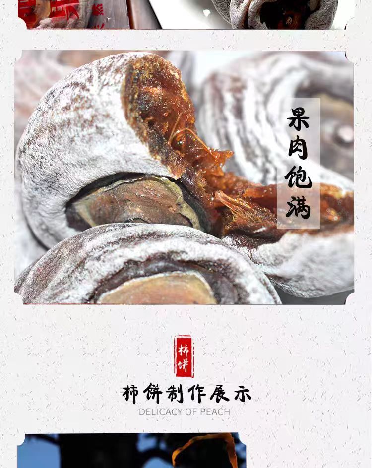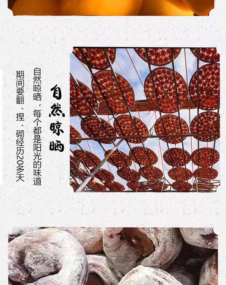 山里日照足、温差大,柿子树喝着山泉水长大,结的红柿/牛心柿个个饱满甜润,果肉细腻糖分高——这原料就赢了一半!老匠人用古法伺候:削皮后挂在竹架上自然晾晒🌞,晒两天揉一揉逼出糖分,再压模定型,全程不添糖不熏硫,全靠阳光和风把柿子“熬”成金疙瘩~咬开瞬间懂了!表皮那层天然糖霜像撒了碎金,果肉软糯黏滑却不粘牙,甜得像化了的蜜却清爽不齁嗓,满嘴都是柿子本身的清润果香,比蜜饯多了份山野的实在劲儿“柿”谐音“事”,过年摆上桌讨个“事事如意”,当零嘴送亲友都是带着家乡温度的诚意