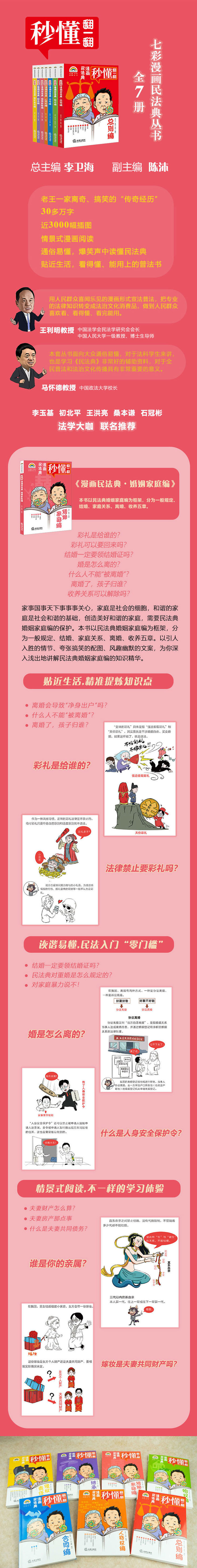 本书是“七彩漫画民法典丛书”系列之一,以民法典婚姻家庭编为框架,分为一般规定、结婚、家庭关系、离婚、收养共五个章节。本书以漫画形式对民法典婚姻家庭编重点法律知识、法条规定进行讲解剖析。用图文并茂的形式,把法律知识详细解读,所配插图不但生动形象,还融入时尚元素,风趣幽默,在辅助理解的基础上,大大增强了可读性,真正做到了人民*众喜欢看、看得懂、看完能用,切实增强了普法工作的针对性和实效性,从而达到了不断提升全体公民法治意识和法治素养的目的。