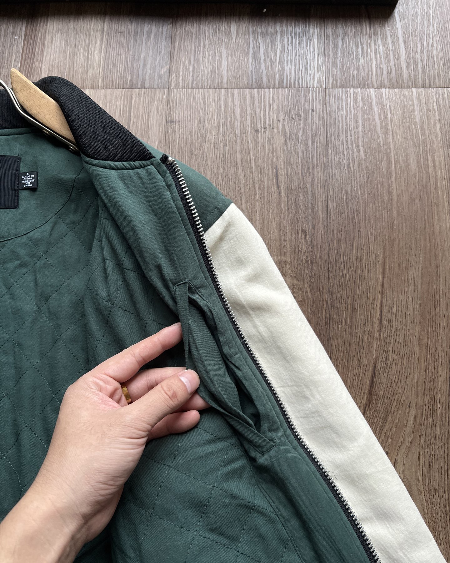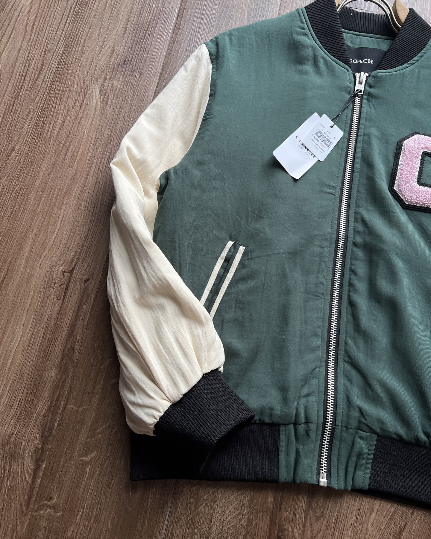 采用经典棒球夹克设计,肩部拼接米白色面料,搭配黑色袖口与裤边,整体线条利落,展现简约时尚感前襟拉链设计,方便穿脱;两侧口袋配以条纹装饰实用性强且提升细节美感,适合日常通勤或休闲场合