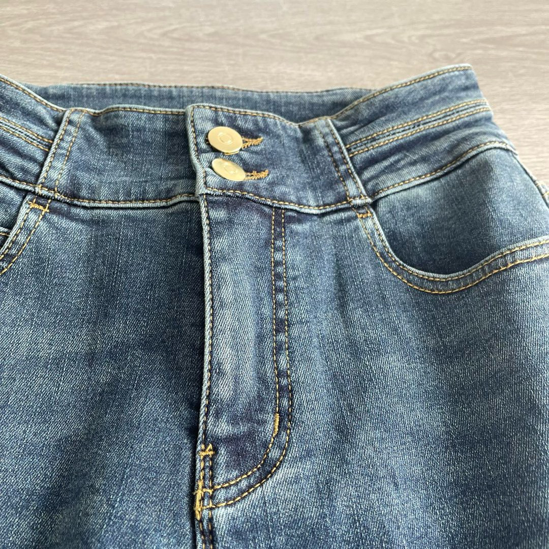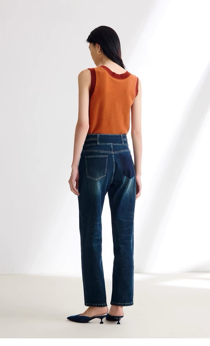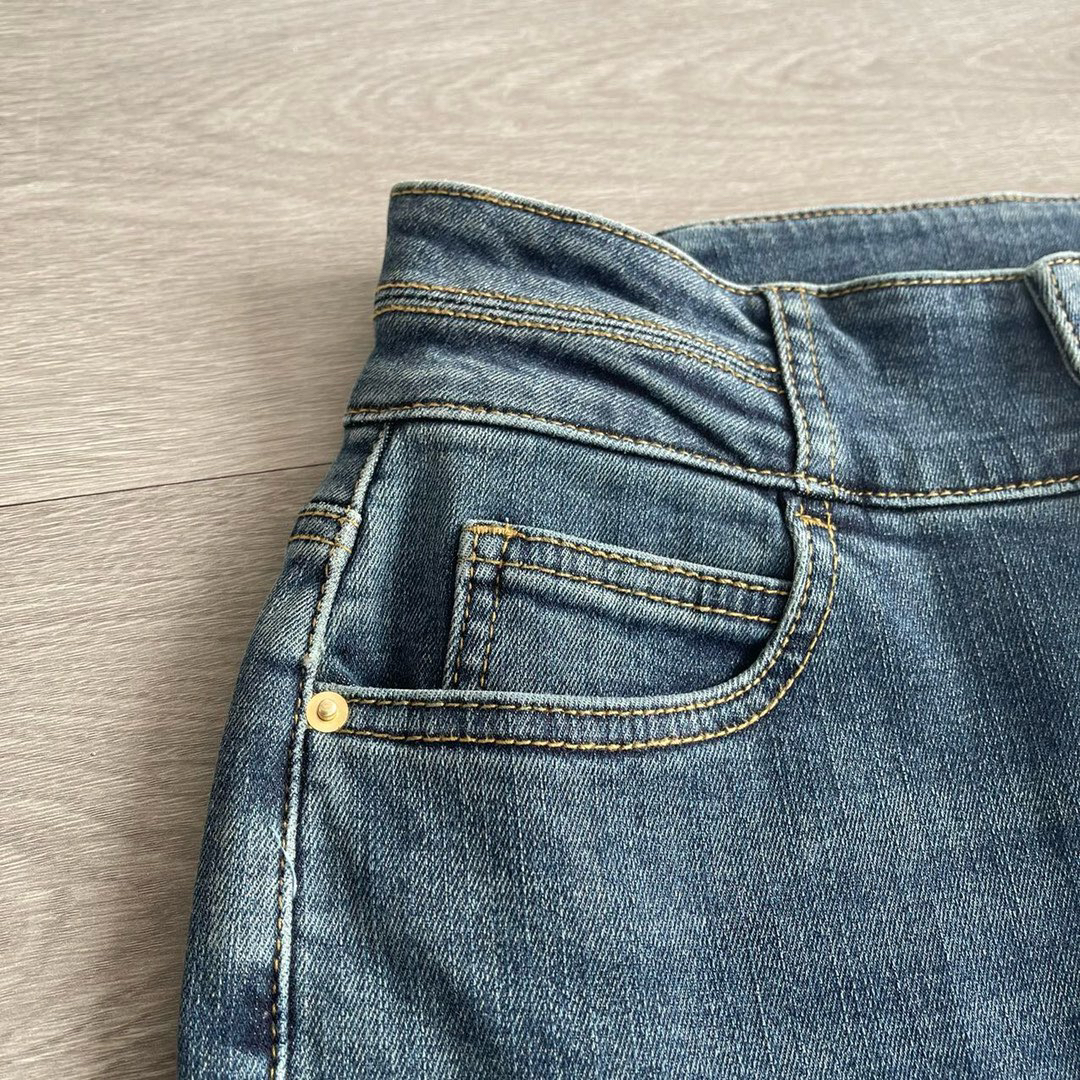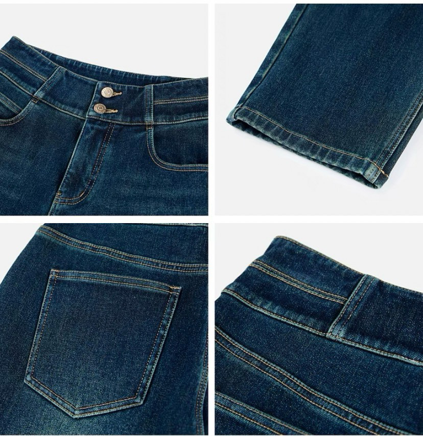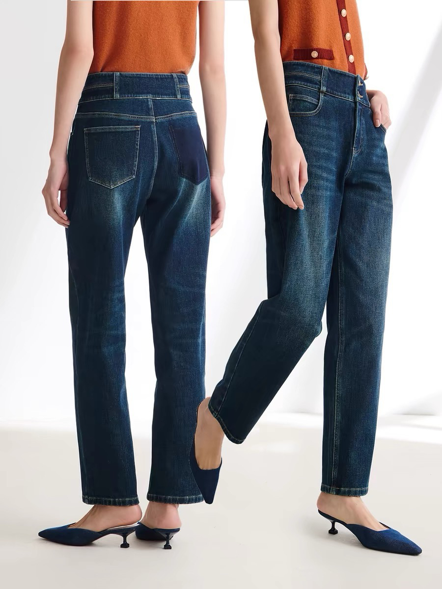 磨毛牛仔裤,反面磨毛更适合秋冬季,贴肤穿着舒适保暖,复古水洗色调,叠加套色的上色工艺为牛仔增添色彩层次感