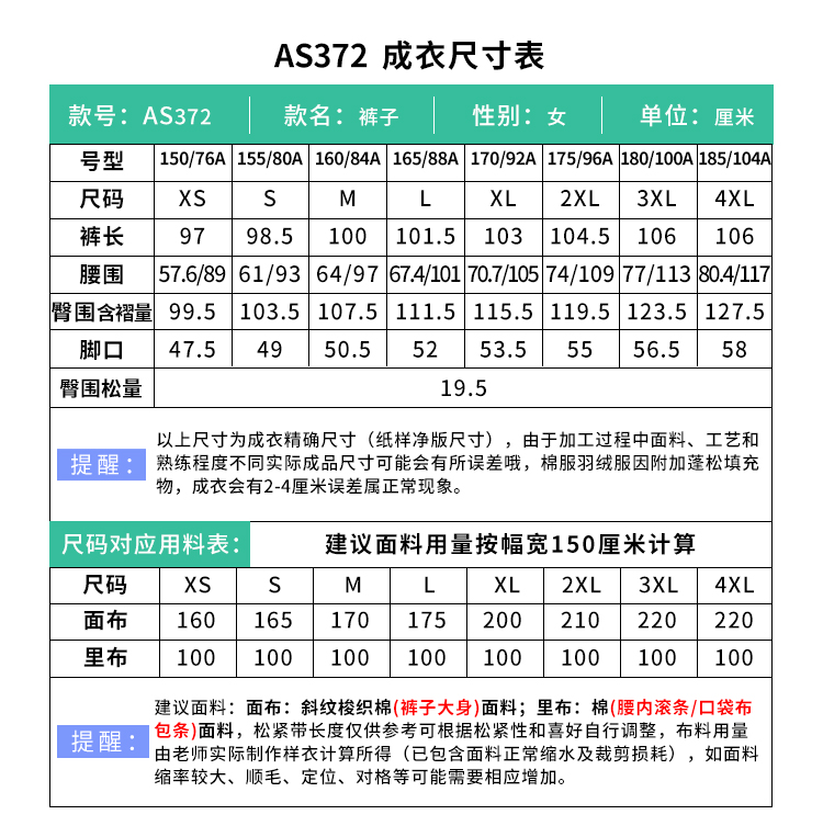 裁缝学苑AS372遮胯直筒裤纸样女装休闲裤显瘦阔腿裤子版型图纸