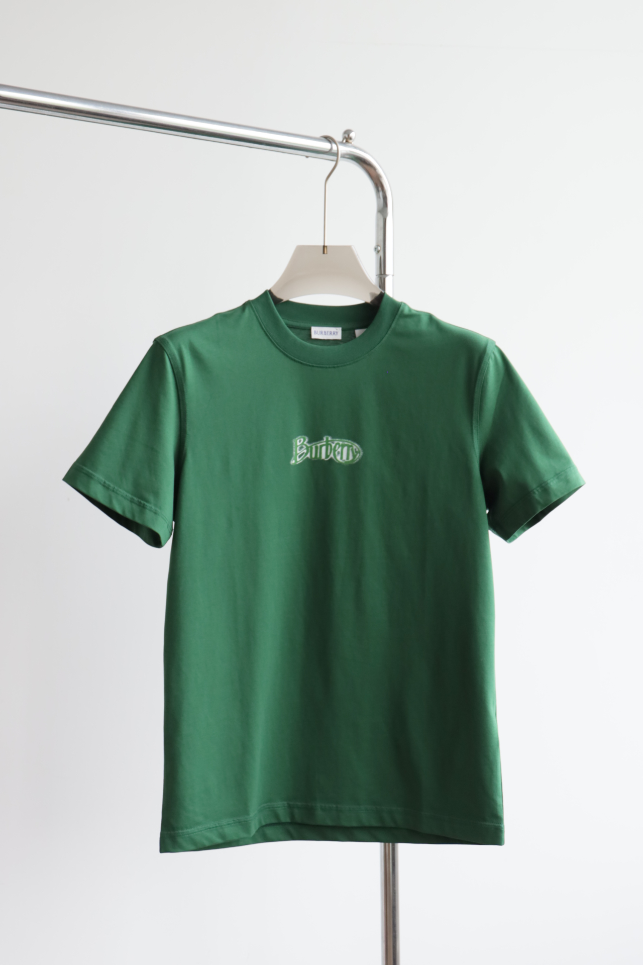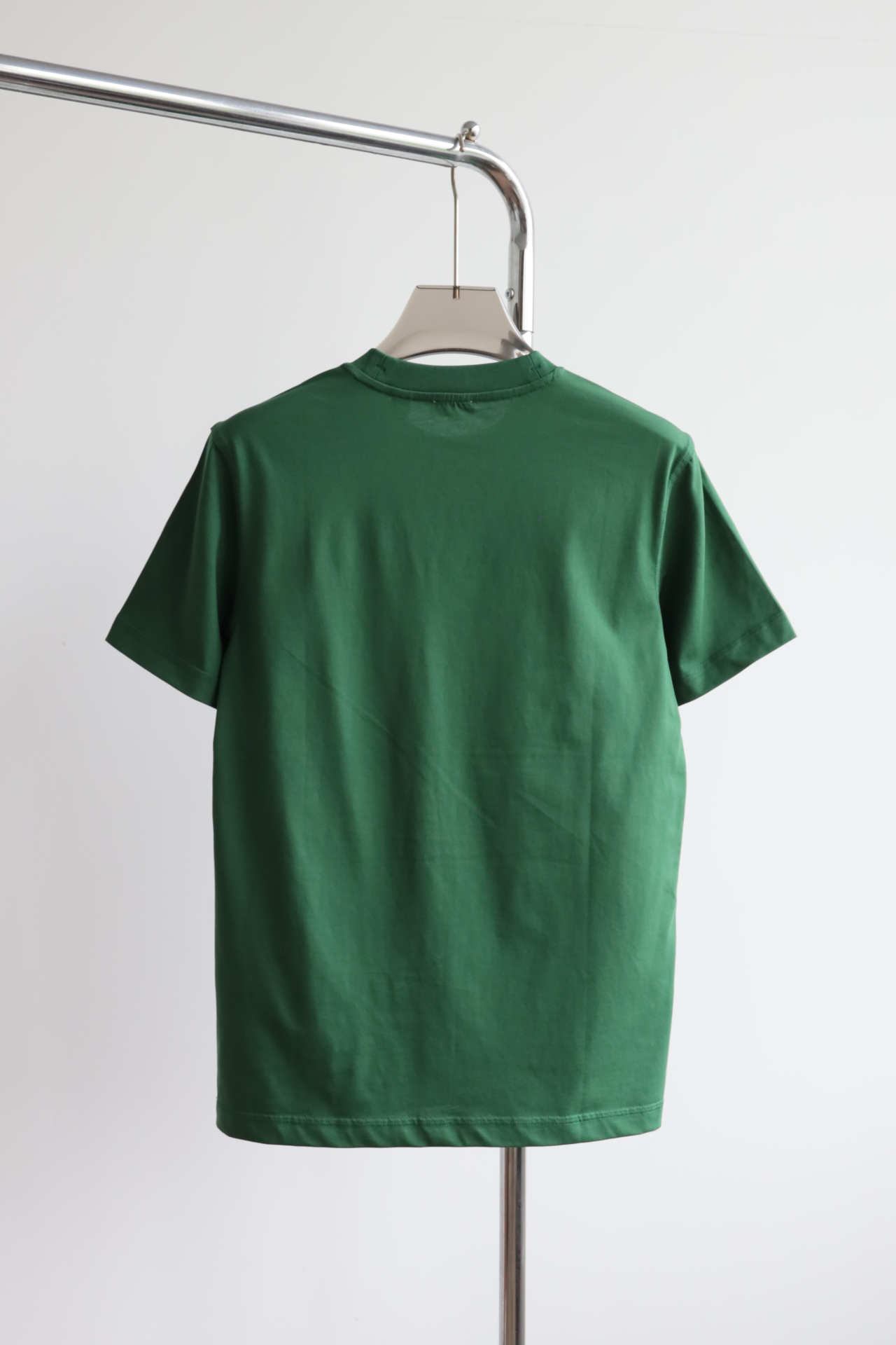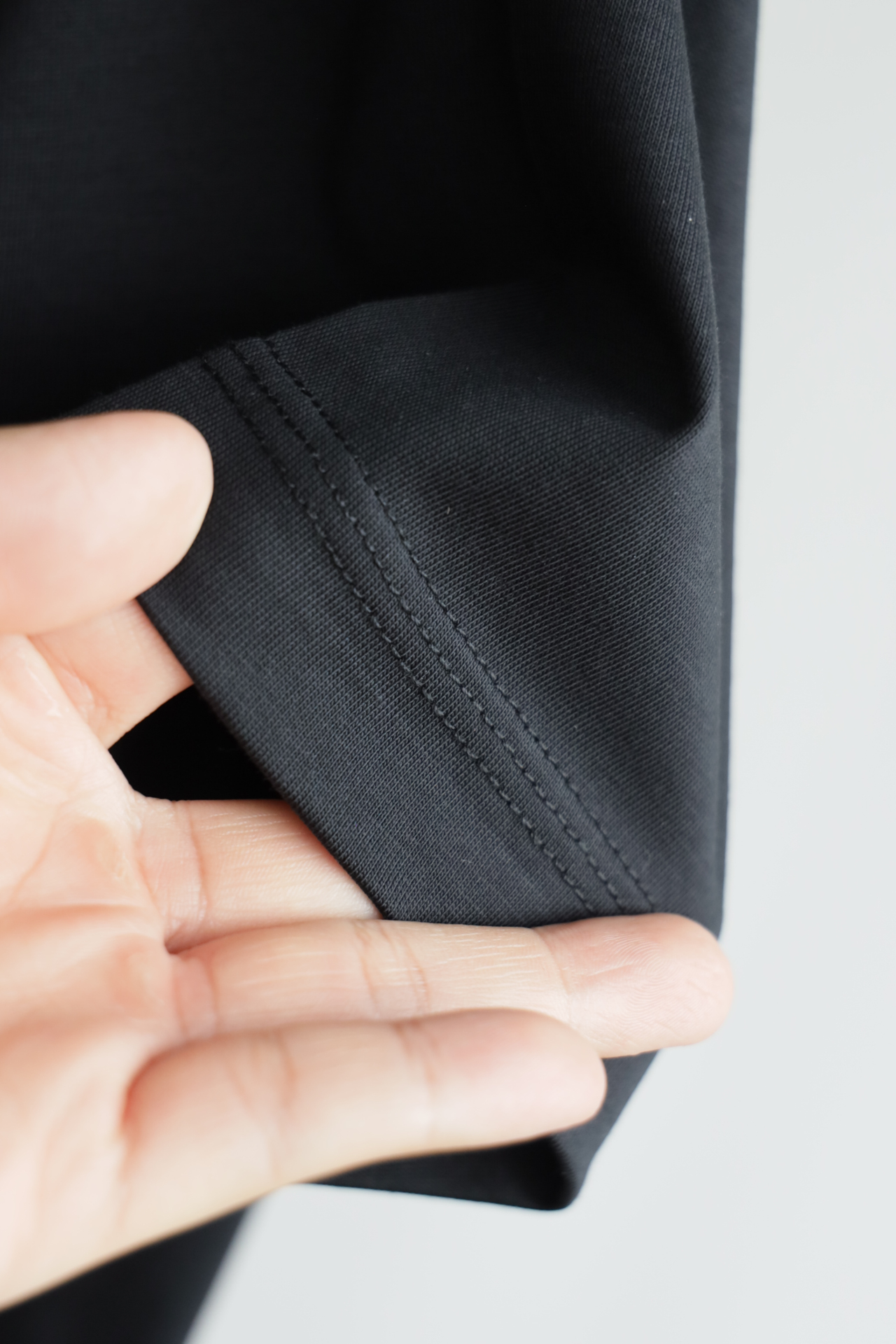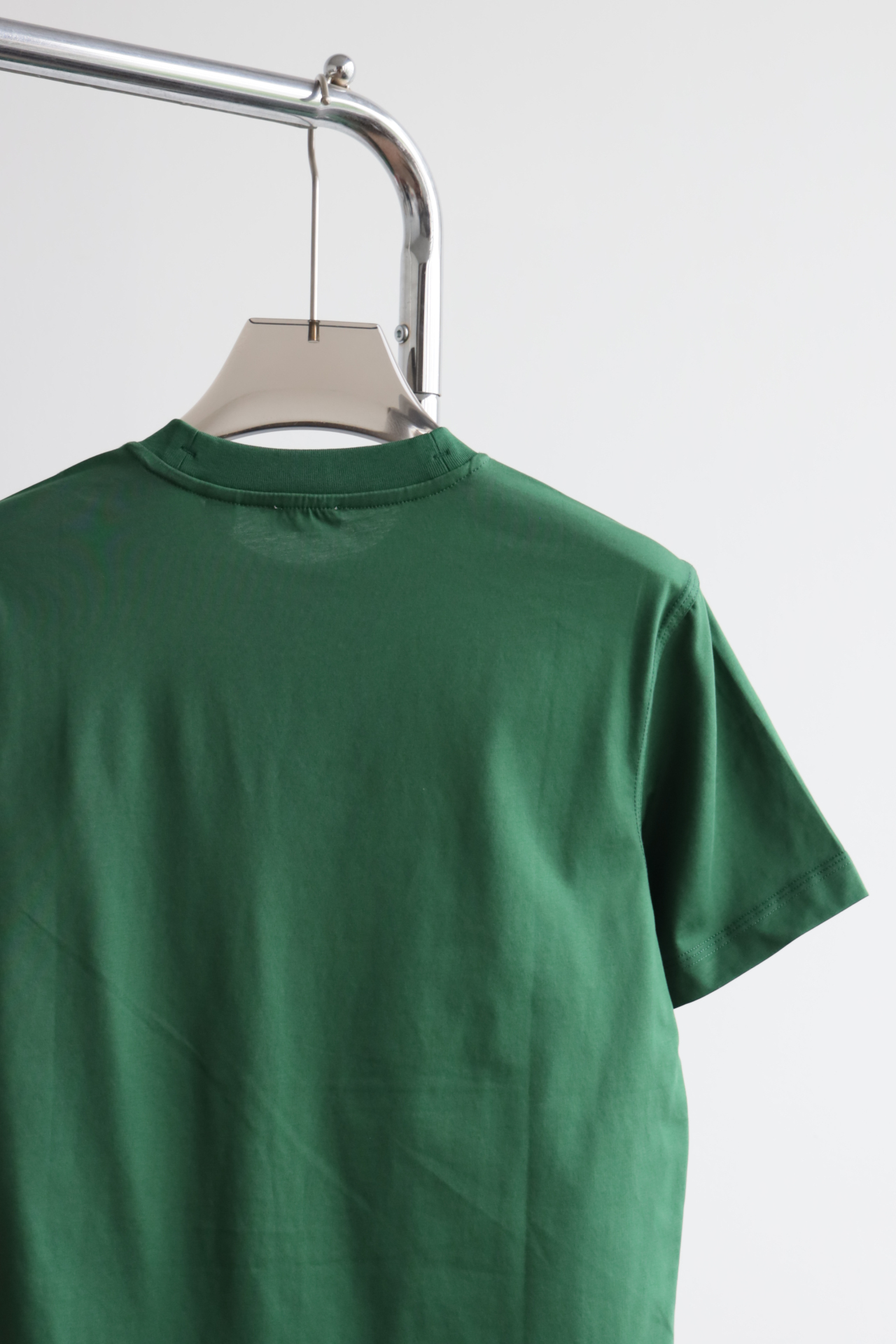 自带垂感的丝光平纹,三道车线锁边,胸口立体植绒字母印花
