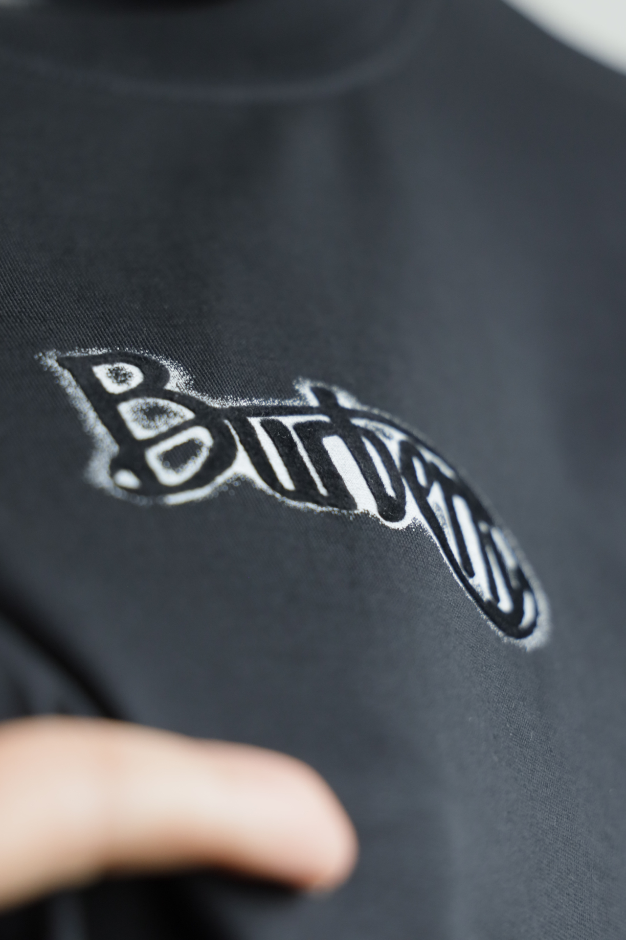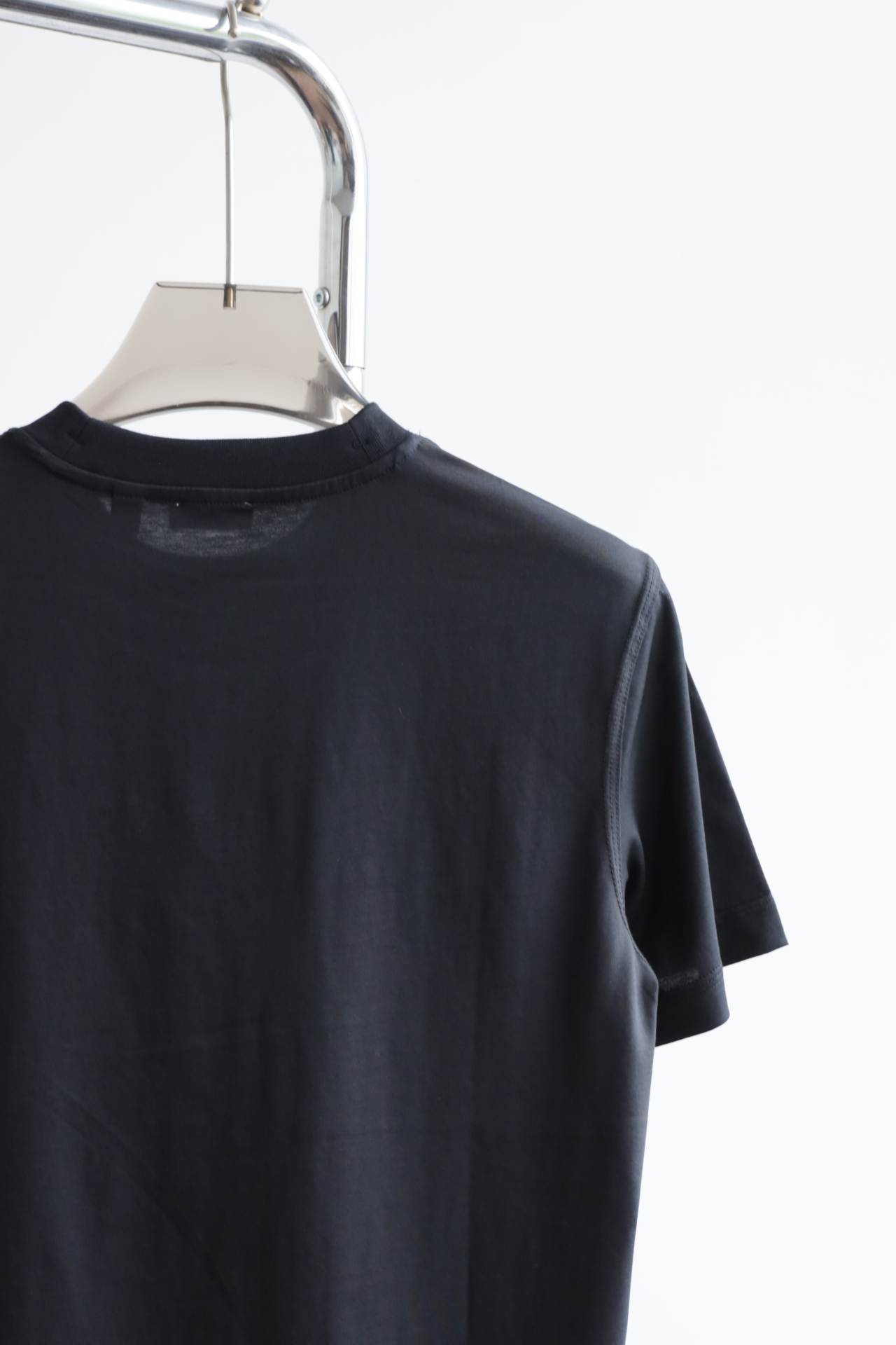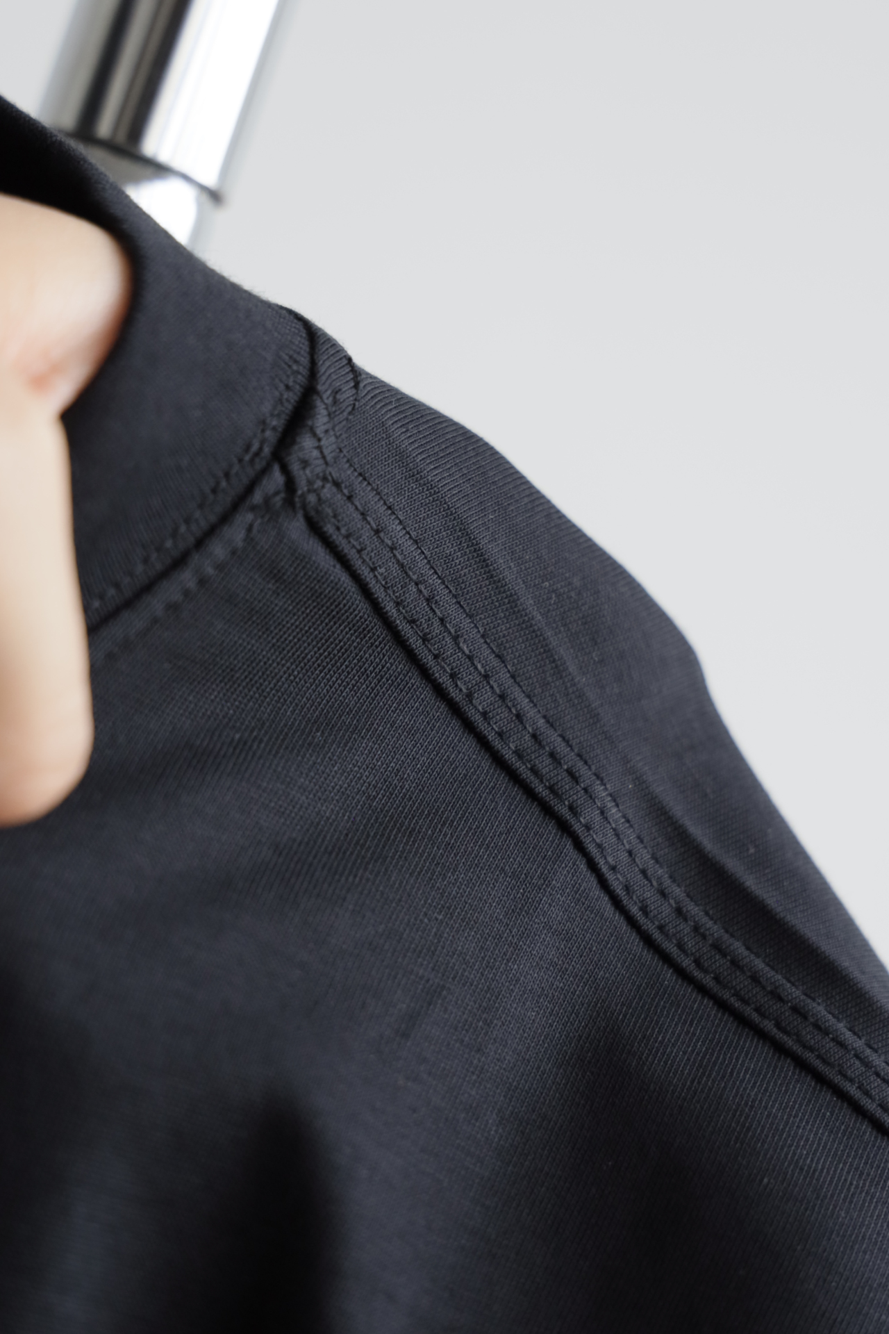 自带垂感的丝光平纹,三道车线锁边,胸口立体植绒字母印花
