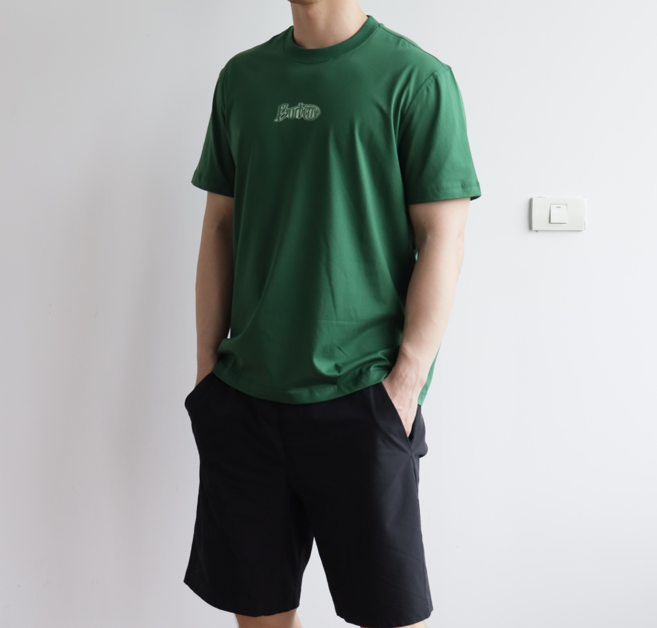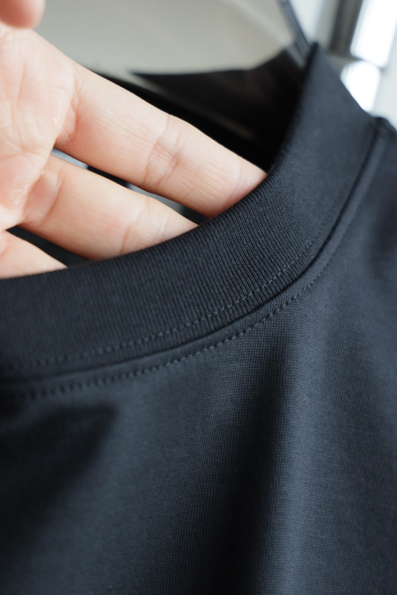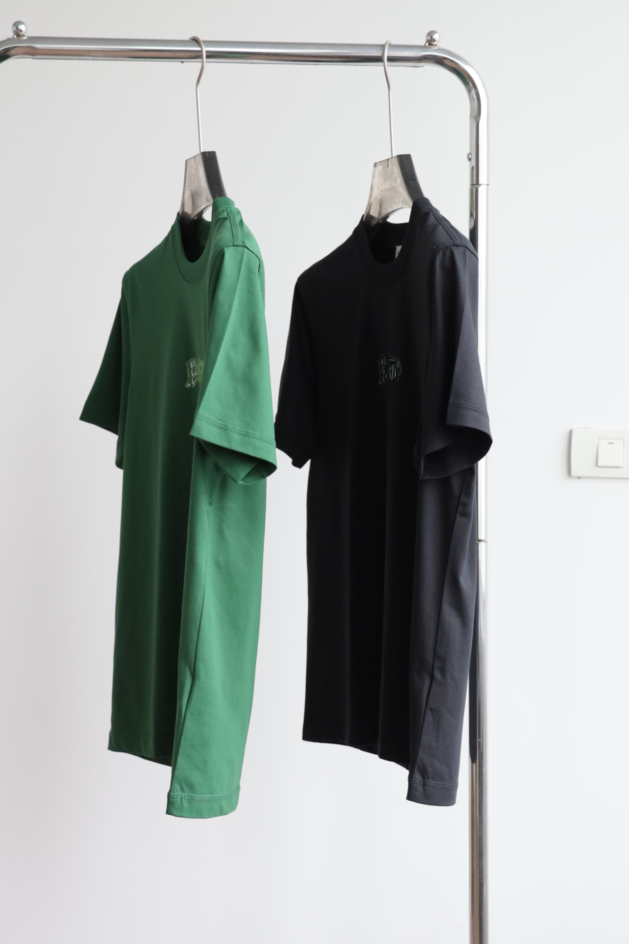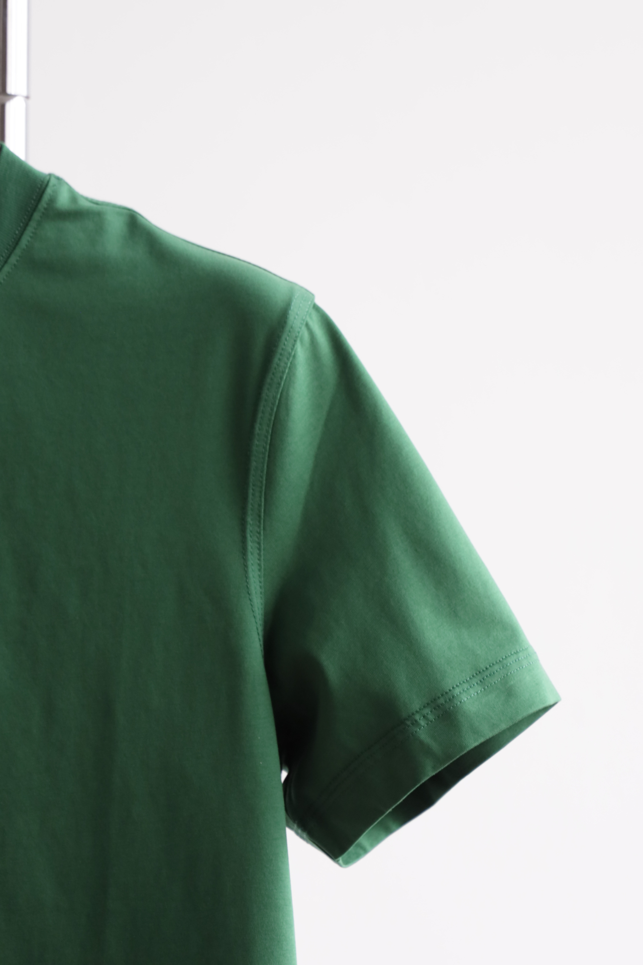 自带垂感的丝光平纹,三道车线锁边,胸口立体植绒字母印花