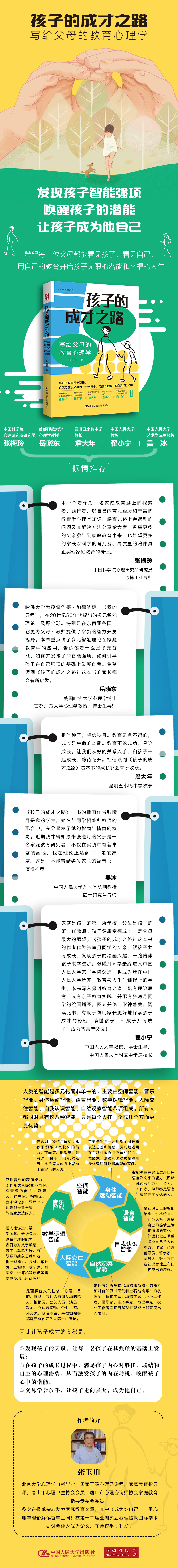 哈佛大学教授霍华德·加德纳博士(我的导师),在20世纪80年代提出的多元智能理论,风靡全球。特别是在东南亚各国,它更为父母和教师提供了崭新的智力开发视野。本书重点讲了多元智能理论在家庭教育中的应用,告诉读者什么是多元智能、如何开发孩子的智能强项、如何引导孩子在自己强项的基础上发展自我。希望读到《孩子的成才之路》这本书的家长都会有所启发。
